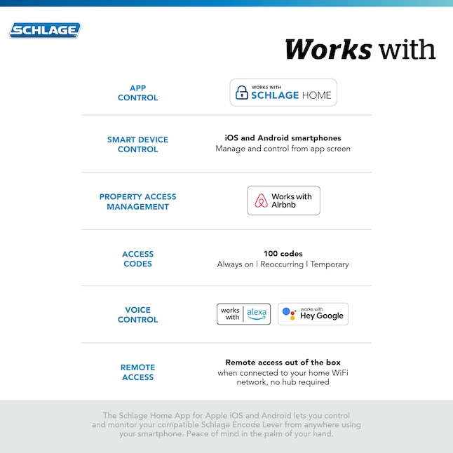 PEACE OF MIND: Lock and unlock from anywhere, manage up to 100 access codes, view lock history, receive customizable notifications and easily manage multiple locks at once - all when paired to the Schlage Home app and connected to a secure WiFi network