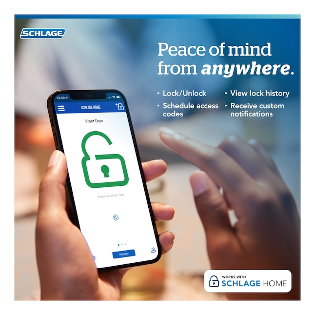 PEACE OF MIND: Lock and unlock from anywhere, mange up to 100 access codes, view lock history, receive customizable notifications and easily manage multiple locks at once - all when paired to the Schlage Home app and connected to a secure WiFi network