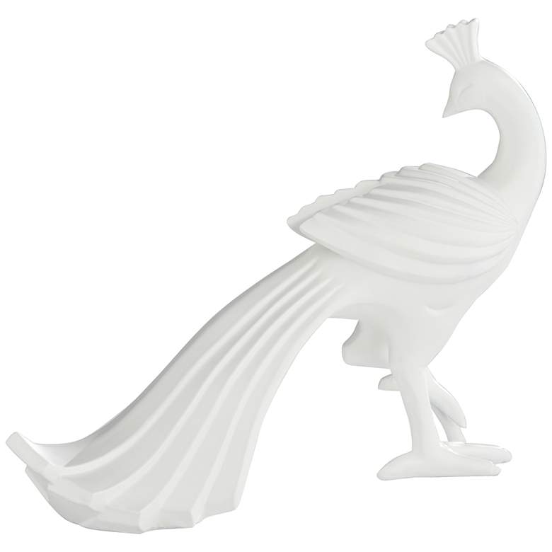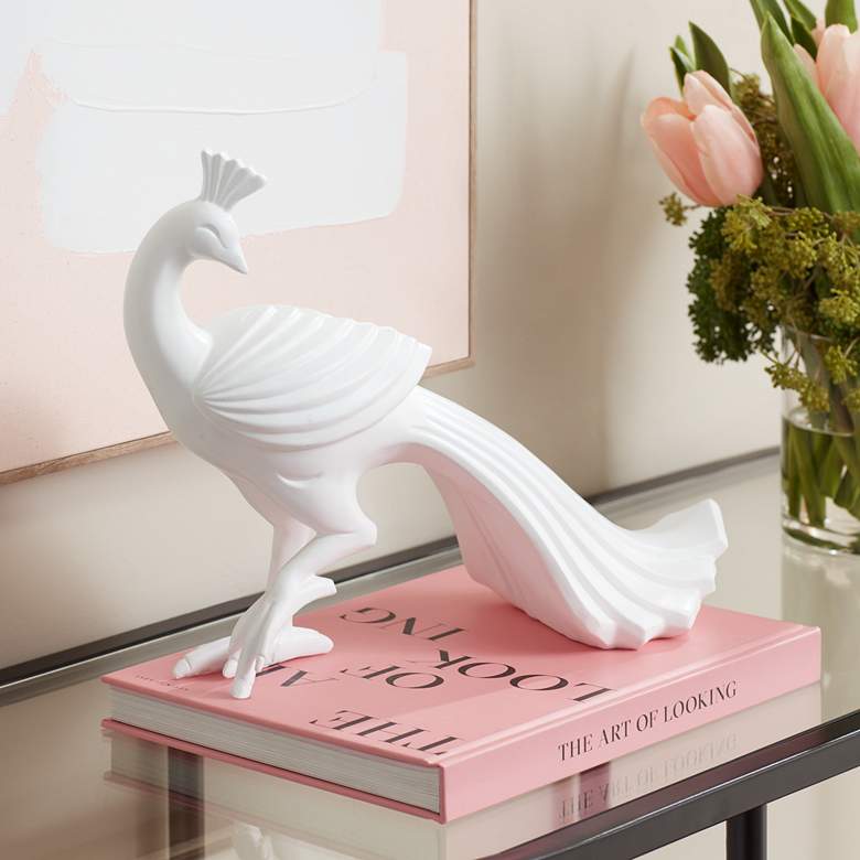 Elegance and artistry merge to create a decadent accent ideal for a modern living space. This modern peacock figurine delivers a chic look with a monotone matte white finish that reveals intricate design detailing. Hand-painted on resin construction, this beautiful peacock figurine is a perfect choice for bird-lovers.