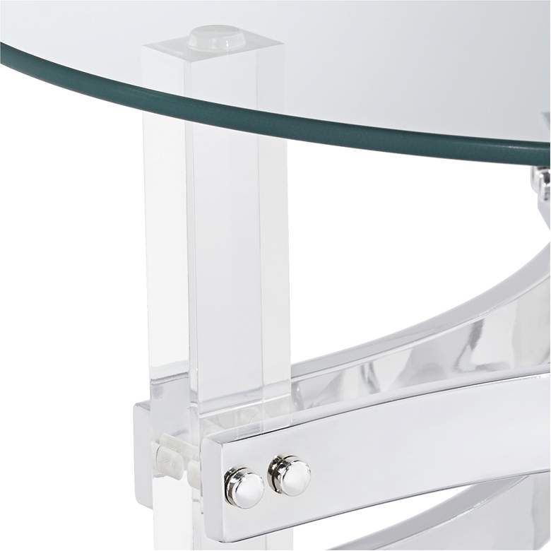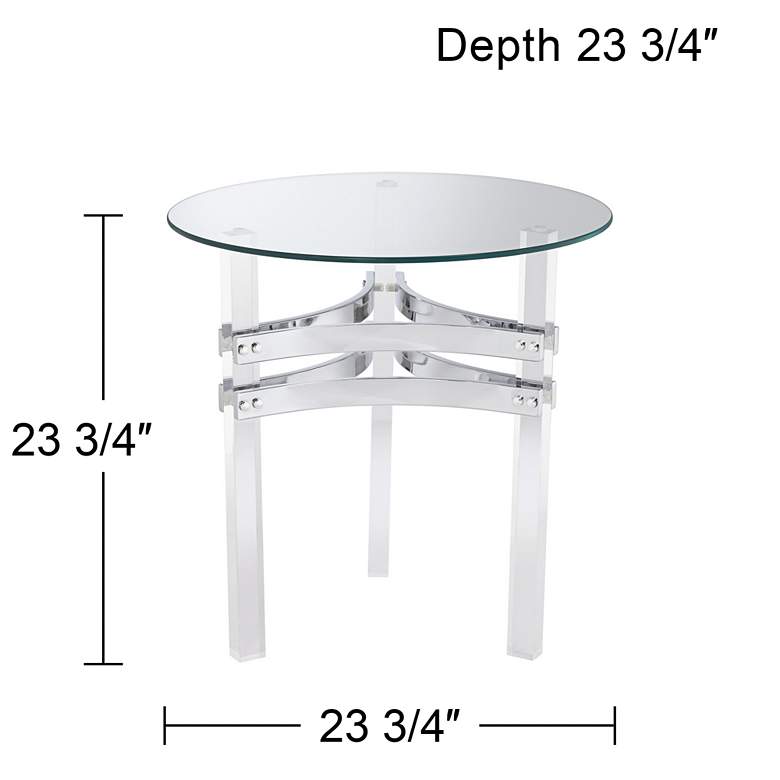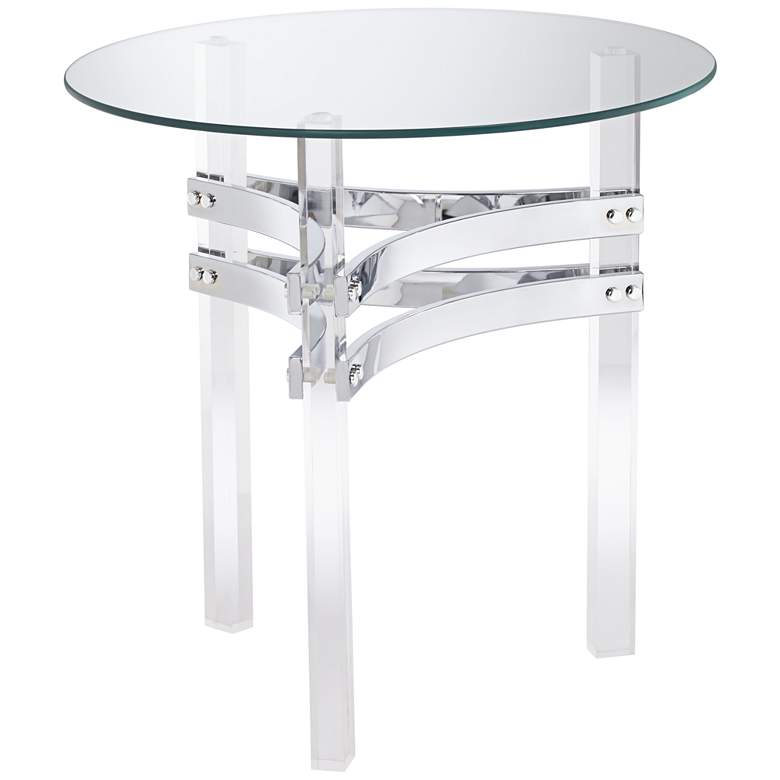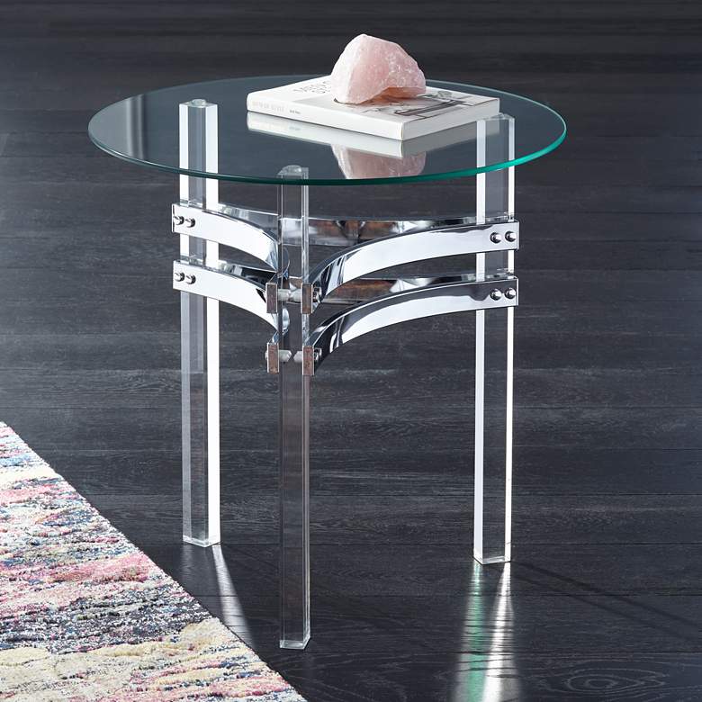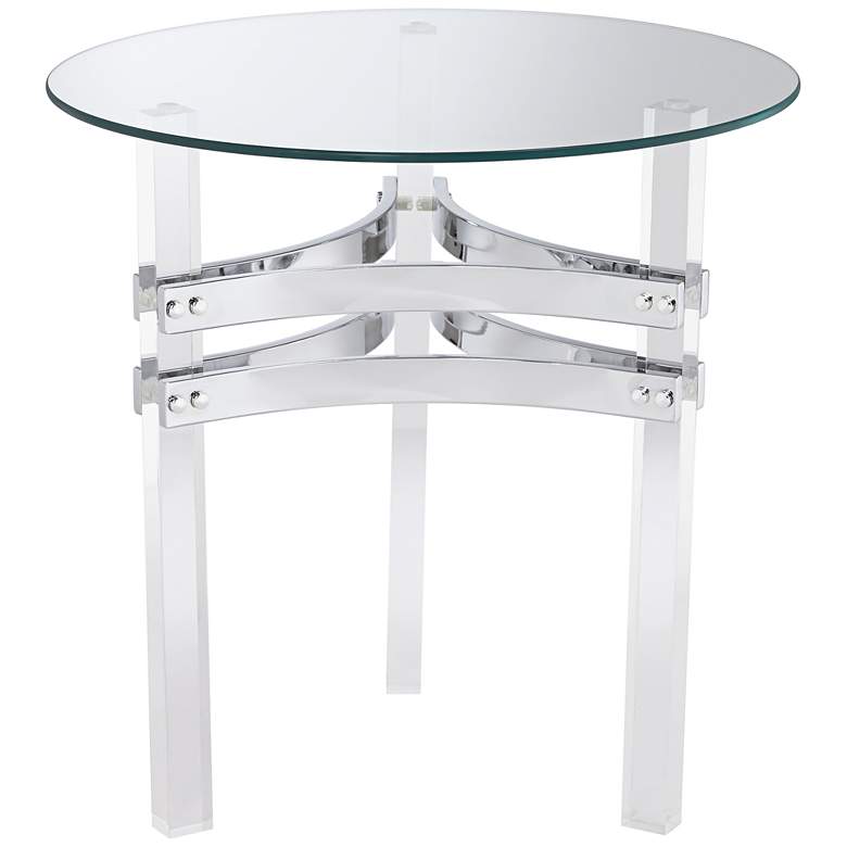 A beautiful addition to the modern living area, a glass tabletop and clear acrylic legs complement this contemporary accent table. Accentuated with chrome finish double straps unifying three legs, this table is an eye-catching addition from Studio 55D.