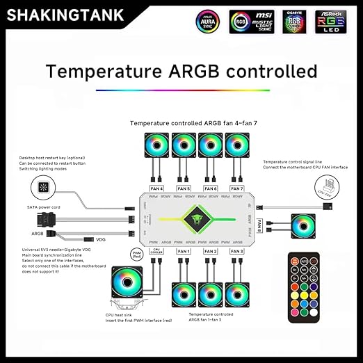 ShakingTank ARGB and PWM HUB 9 PortsFor A-RGB &PWM Case Fan Hub with Controller and SATA Power Input, Magnetic backplane Splitter 5V/3PIN ARGB Case Fan Hub Adapter PWM ARGB Fan White