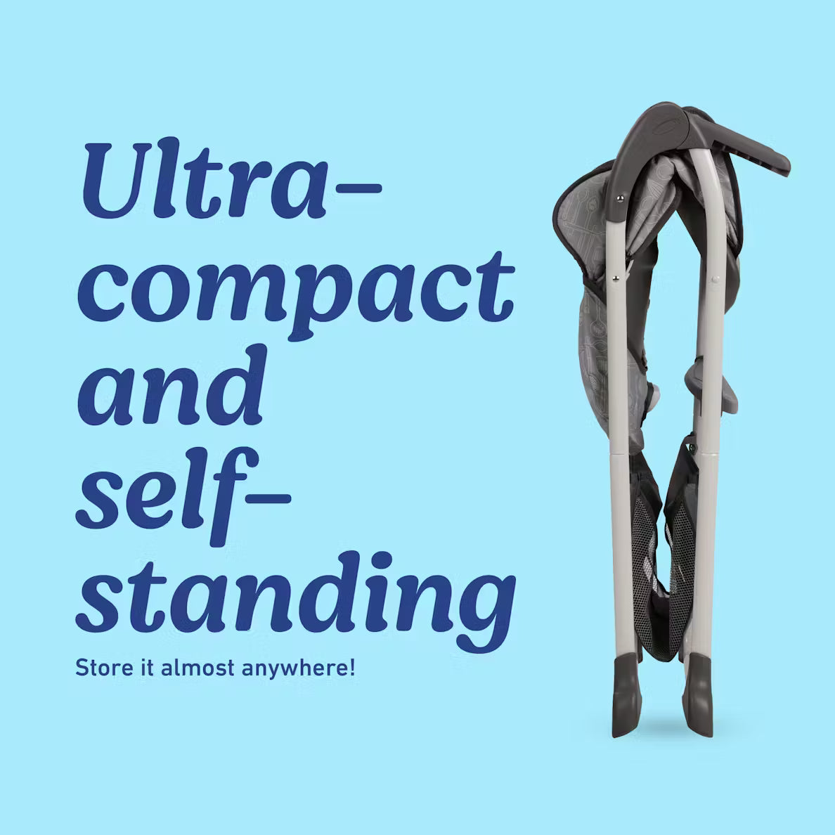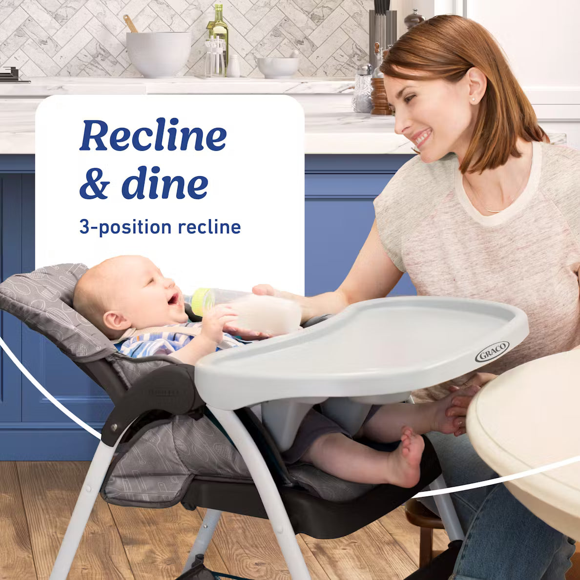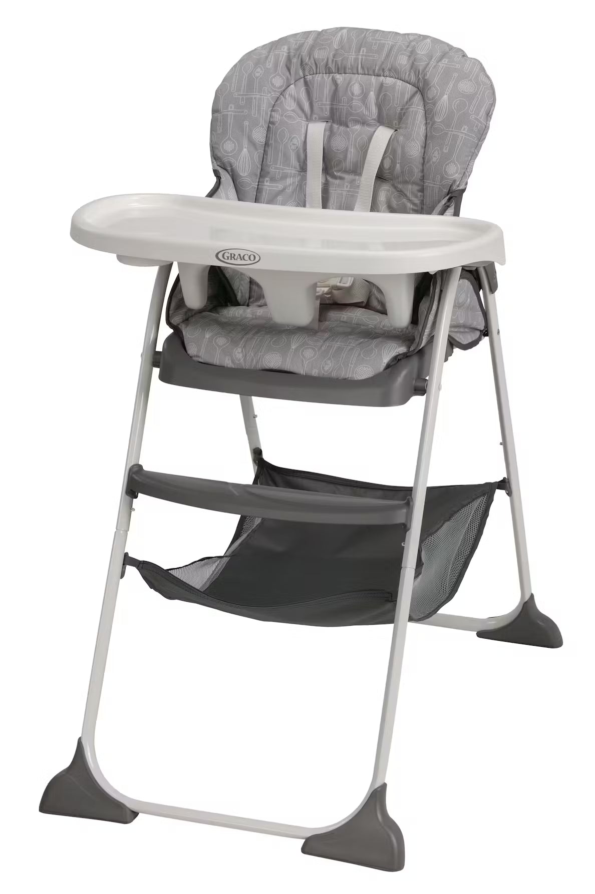The Graco® Slim Snacker™ Highchair is the ultra-fast folding highchair with a one-hand, one-second fold. Once folded, it’s ultra-compact, so it fits in small spaces and is self-standing for easy storage. Cleaning this slim highchair is a snap, too–just wipe the seat pad down to keep your child’s dining space tidy. A large mesh storage basket is perfect for storing extra bibs and wipes, and a full-size cup holder keeps their cup in place. The 3-position reclining seat, footrest, and seat pad keep your child comfy during meals and snacks.