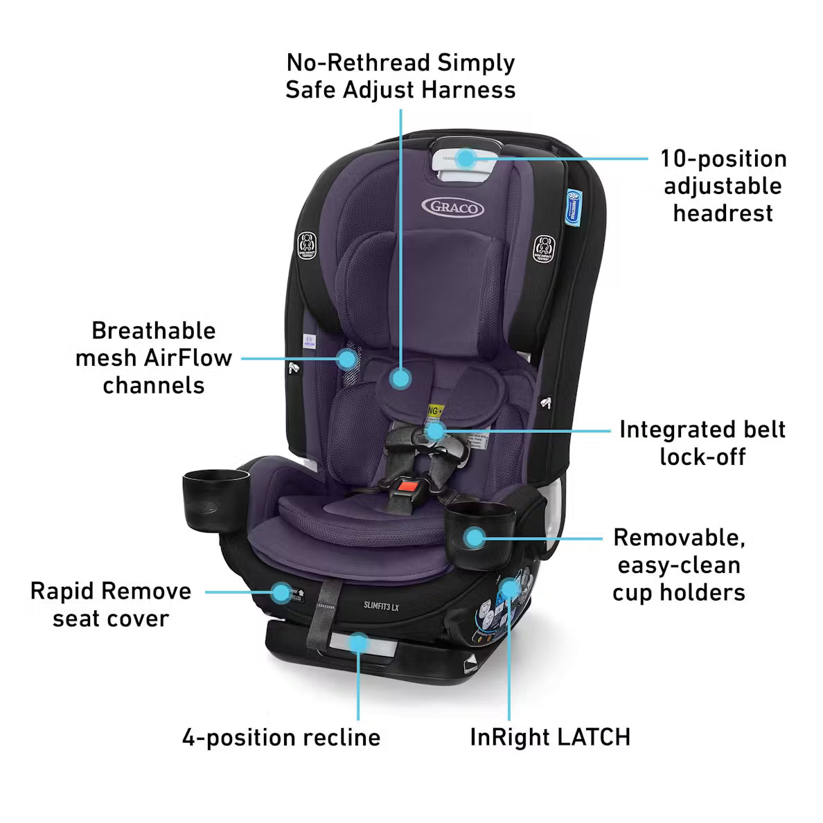 The Graco® SlimFit3™ LX 3-in-1 Car Seat is our slimmest design that fits 3 car seats across, saving space in your back seat without compromising on the safety you trust and the features you need. This narrow all-in-one car seat grows with your child from rear-facing harness (5-40 lb) to forward-facing harness (26.5-65 lb) to highback booster (40-100 lb). We tested our lightweight 3-across car seat in every configuration, to help ensure your growing family can fit in your vehicle, even with children of different ages who ride in different modes, or when paired with select other Graco car seats. Integrated belt lock-off makes for easy vehicle seat belt installation in forward-facing mode, and allows you to position your seats to maximize space with 3 across. Graco’s exclusive push-button InRight™ LATCH provides an easy, one-second attachment with an audible click to help ensure secure installation. We made thoughtful design choices to make the SlimFit3 easy to adjust with 3 car seats in the back seat. The No-Rethread Simply Safe Adjust™ Harness System allows you to adjust the height of the headrest and harness to 10 positions with just one motion for just the right fit. Easily adjust the 4-position recline for a better installation and a comfortable ride. The Rapid Remove cover comes off in 60 seconds, without uninstalling the seat or removing the harness, and is machine washable. Plus, the SlimFit3™ is slim enough to fit 3 across, but spacious enough to keep your growing child comfy. Breathable mesh AirFlow channels provide improved ventilation to keep your child cool and comfortable. Two cup holders are designed to work with the three-across configuration to keep drinks and snacks close at hand. Fuss-free harness storage pockets conveniently hold the harness out of the way while your child gets in and out. Removable, plush head and body inserts help to keep your infant feeling cradled and comfortable. The steel-reinforced frame provides strength and durability for years of use, and EPS energy-absorbing foam provides effective impact energy management. This car seat is Graco® ProtectPlus Engineered™ to help protect in frontal, side, rear, and rollover crashes.