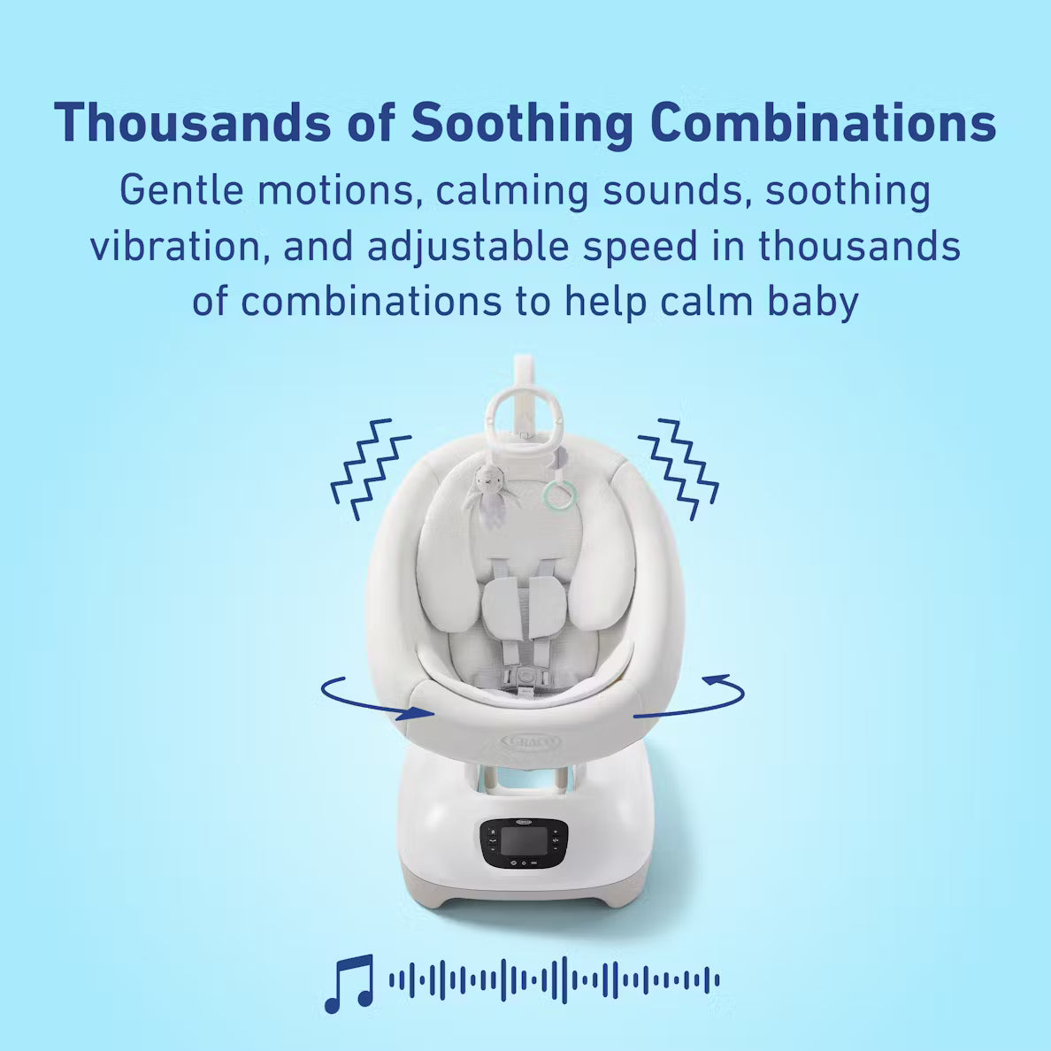 The Graco® SmartSense™ Soothing Baby Swing starts to soothe your baby in seconds, with technology that hears your baby's cries and responds with calming sound and motion. This baby swing offers thousands of combinations of gentle motions, soft vibration, multiple speeds, white noise, and calming music to help create more peaceful, happy moments for you and your baby. Swing, rock, cradle, and glide motions mimic the way parents naturally soothe their babies, while a cozy body support made with organic cotton fabrics helps keep baby comfortably snug. Three recline positions allow you to customize the swing to what your baby likes best, and a toybar adds additional interest for curious little hands and eyes. The 5-point harness keeps your child secure. SmartSense is the winner of the 2025 Parents Best for Baby Awards and the Motherhood Community Awards: Best Swing of 2025.