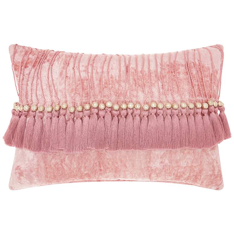 A romantic shade magnifies the beauty of a contemporary accent pillow with design power. This decadent rectangular throw pillow from the Sofia collection by Mina Victory for Nourison features beaded wood and tassel detailing over rose polyester velvet fabric and a solid rose back, adding just enough artistry to make a statement. This sophisticated throw pillow features a zipper closure offering easy access to a plump polyester insert. This pillow is hand-made with a hand-crafted cover.