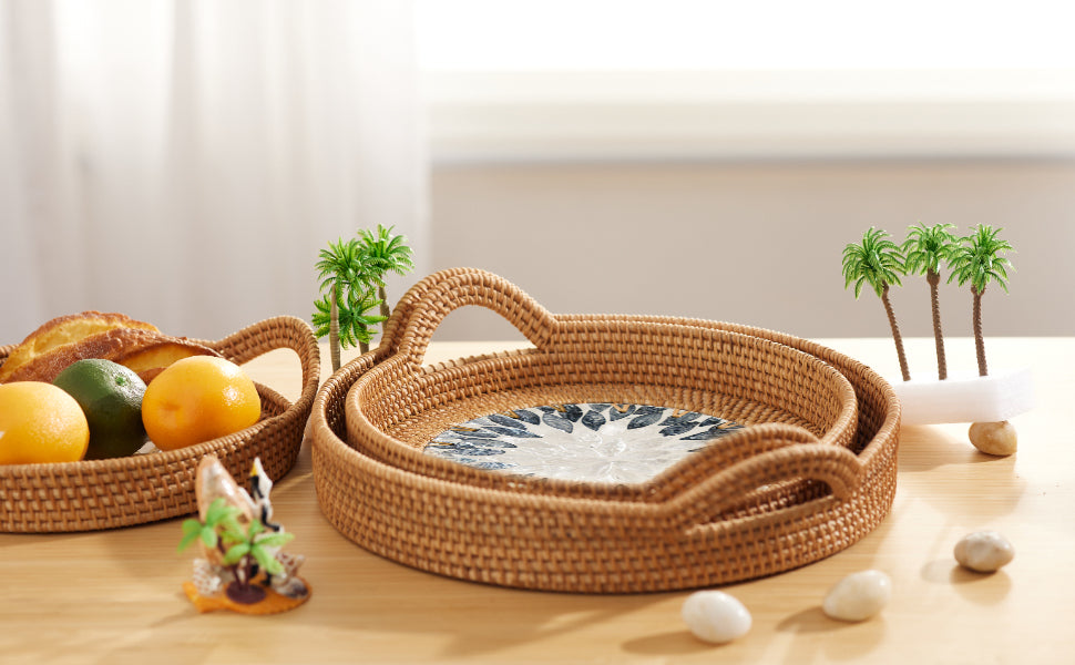- Handwoven Rattan with Natural Shell Inlay- Each tray is artisan crafted from durable rattan and accented with natural shell mosaic inlay creating a unique eye catching centerpiece for any room.