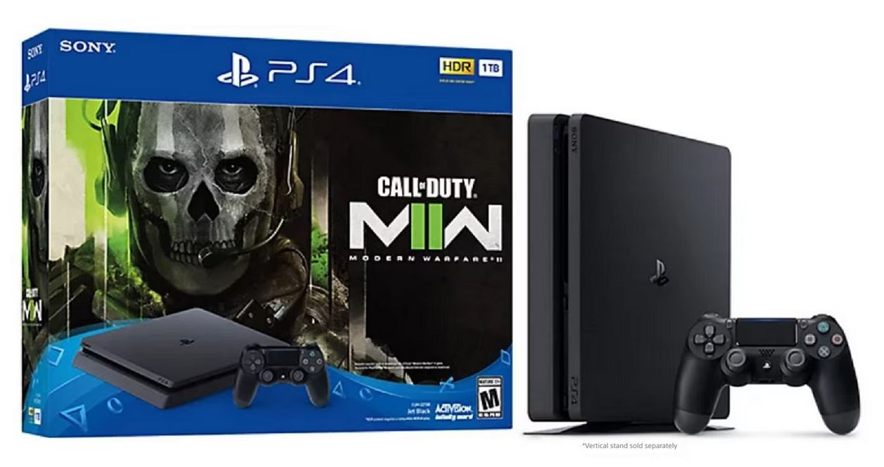- Bundle includes - PS4 console, Call of Duty: modern Warfare II - full game voucher, wireless controller, HDMI cable, AC power cord, USB cable, and printed materials.