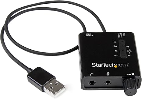 StarTech.com USB Sound Card w/ SPDIF Digital Audio & Stereo Mic – External Sound Card for Laptop or PC – SPDIF Output (ICUSBAUDIO2D),Black 0.6" x 1.8" Compatible Devices: Personal Computer Brand: StarTech Hardware Interface: USB Audio Output Mode: 2.1 Platform: Mac OS X About this item: SPDIF OUTPUT: This external USB sound card is equipped with SPDIF digital output with AC3 (Dolby Digital) and DTS pass-through support. EXTERNAL FEATURES: Use this USB external sound card audio adapter to easily adjust the sound output with its external volume and EQ controls. SOUND CARD REPLACEMENT: This USB stereo audio adapter lets you replace an internal sound card on your laptop or PC with a small, compact device. MULTI-USE SOUND CARD: This digital audio adapter with SPDIF can be used in a variety of applications, including home-theater surround sound support. Add home-theater surround sound support with the integrated digital S/PDIF output Replace an internal sound card easily with a compact external USB device Adjust sound output easily with external volume and EQ controls