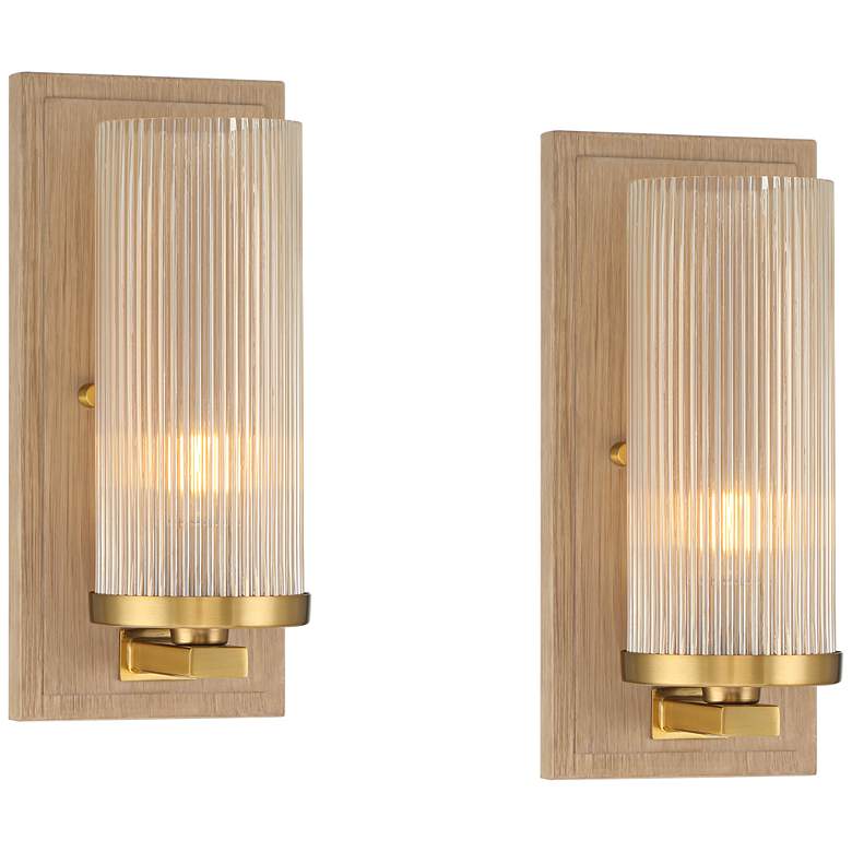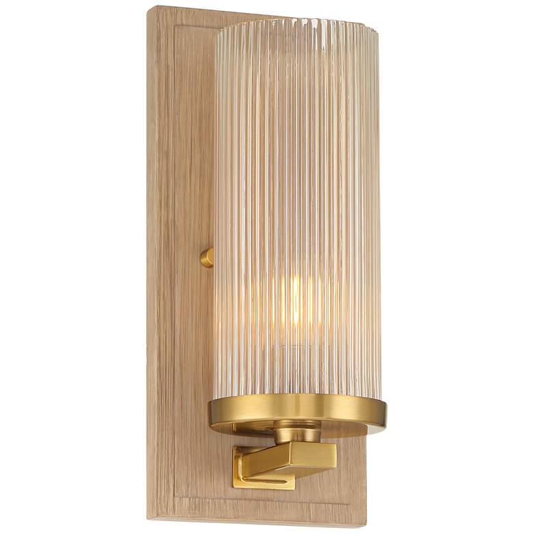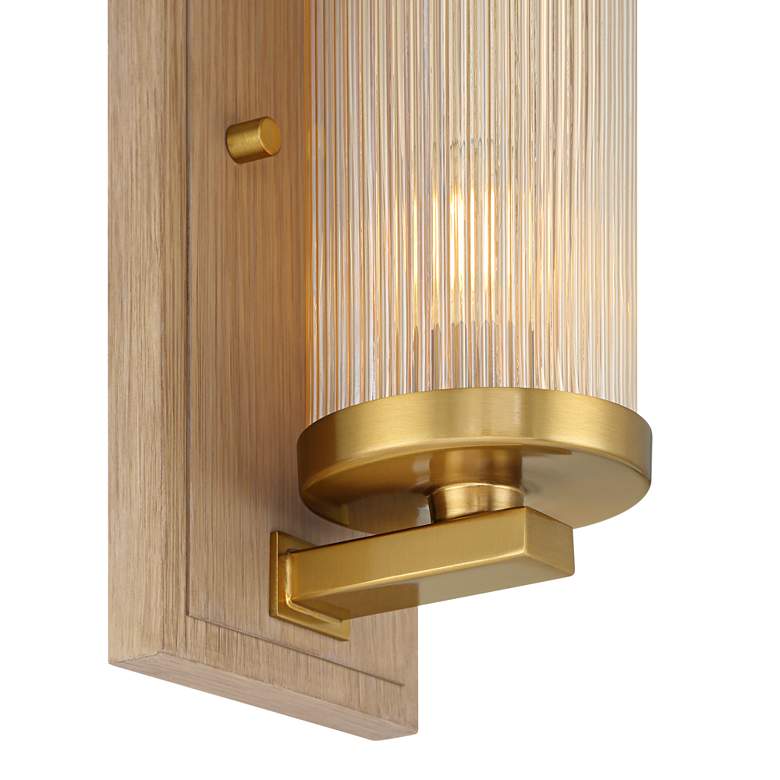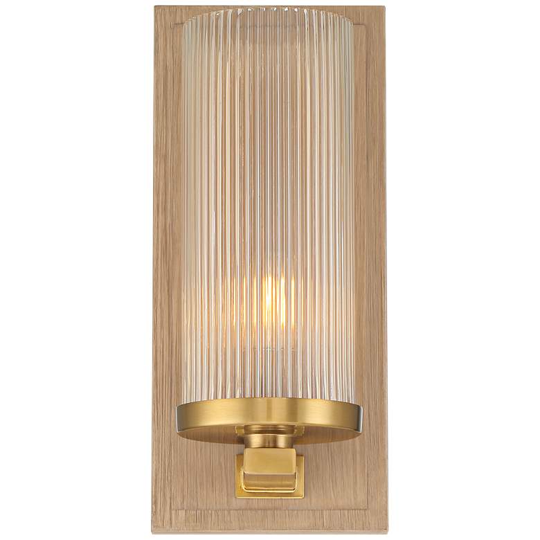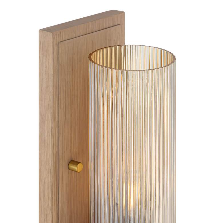 A stylish design for a bathroom or bedroom area, this contemporary wall sconce comes in a wood finish rectangular frame with gold finish accents. A cylinder shade of champagne ribbed glass, designed to take a single light bulb, is the centerpiece of this sconce. An Stiffel lighting design exclusive to Lamps Plus.