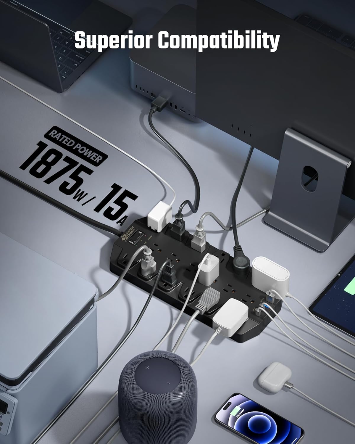 - 【22-in-1 Versatile Power Strip】SUPERDANNY heavy duty power strip equipped with 18 AC outlets, 2 USB-A ports, and 2 USB-C ports to gaming room or streaming, office desk, TV, phone, tablet, PC, laptop, and other devices simultaneously.