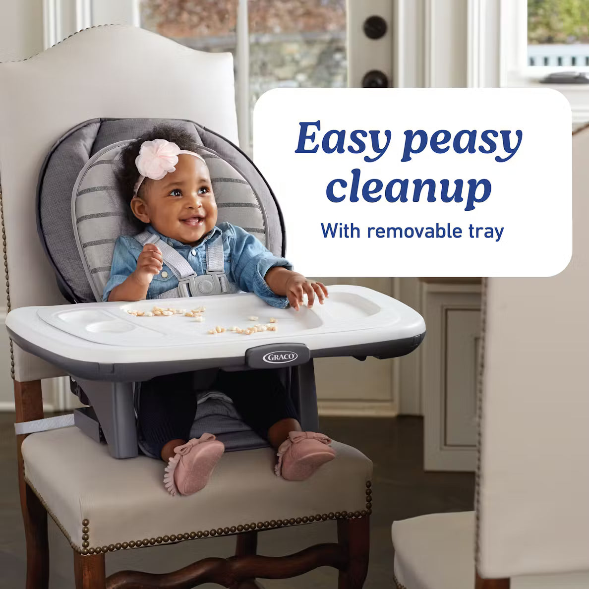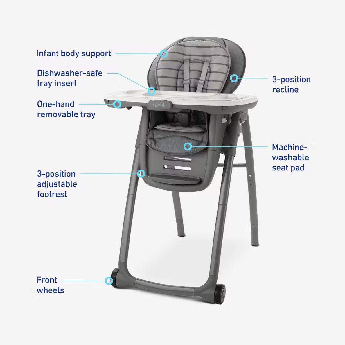 The Graco® Table2Table™ Premier Fold 7-in-1 Highchair grows with your child from infant to toddler. The highchair features recline for early feedings, then converts to an infant booster, toddler booster, and toddler chair for baby and toddler to join the family at your table, and becomes a toddler-sized table and chair for your independent big kid. The highchair even allows seating for 2 children at once to grow with your family. The 5 height adjustments, 3-position removable footrest, and 3 recline positions ensure the most comfortable fit for baby at the family table. When not in use, the highchair folds compactly for storage.