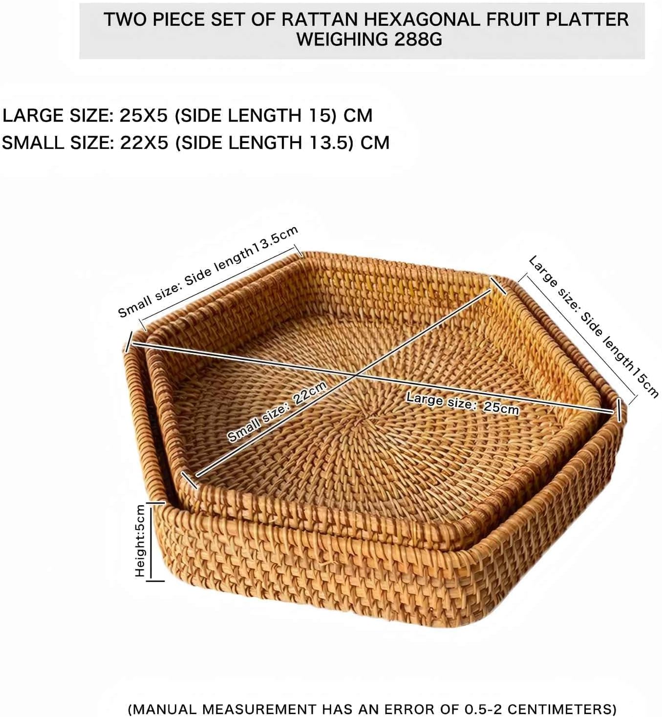 - Spacious interior space: This basket is hexagonal, with a large size measuring 15 centimeters (5.9 inches) on each side, 25 centimeters (9.8 inches) wide, and 5 centimeters (1.9 inches) high. The small size measures 13.5 centimeters (5.3 inches) in length, 22 centimeters (8.6 inches) in width, and 5 centimeters (1.9 inches) in height, providing ample space for your storage or service needs