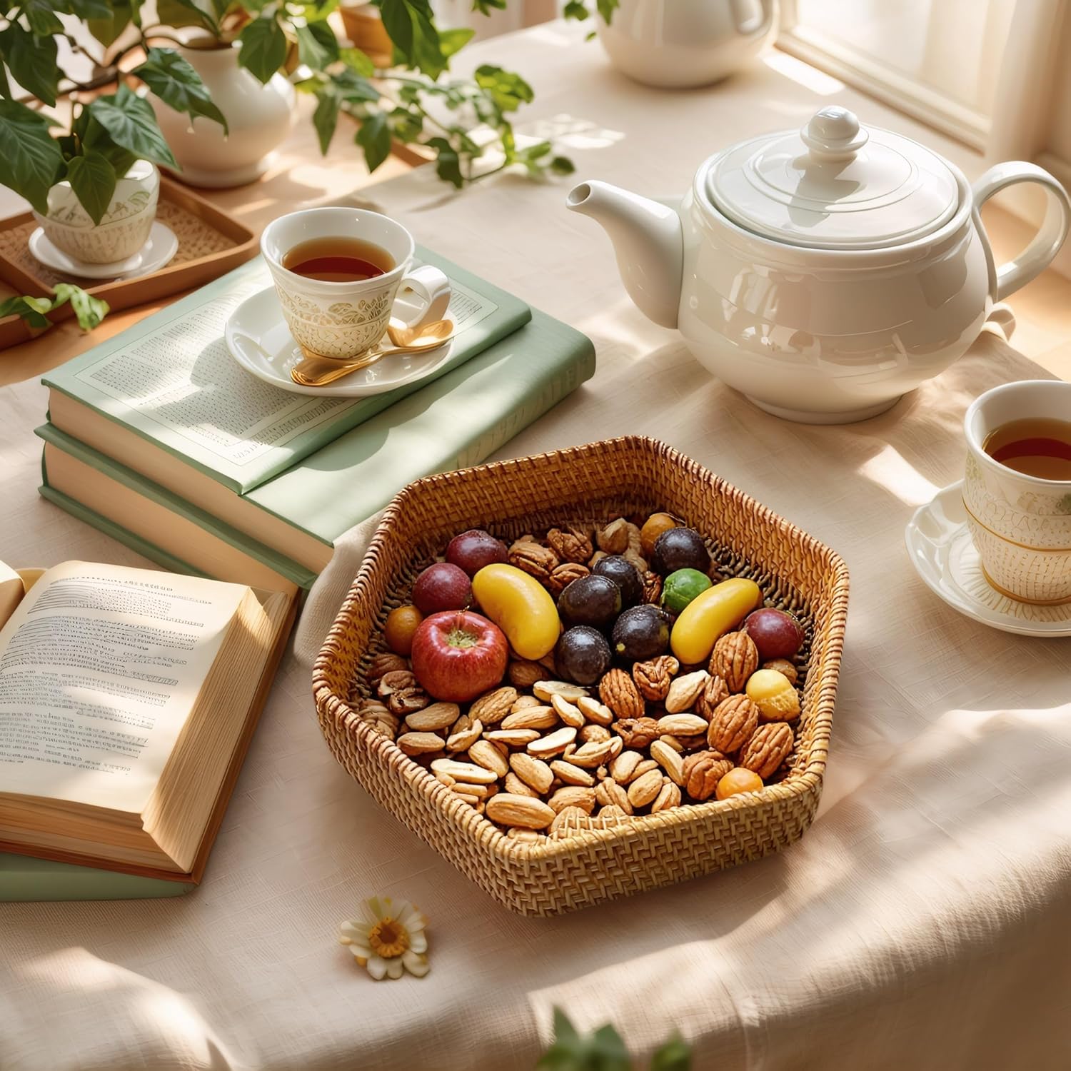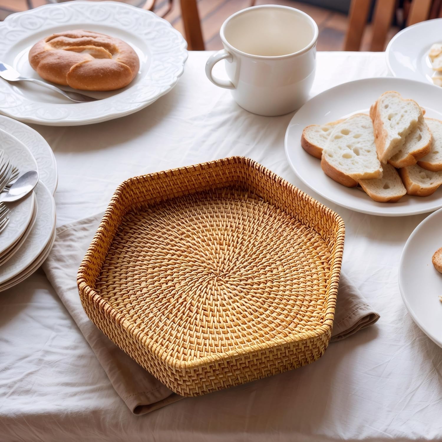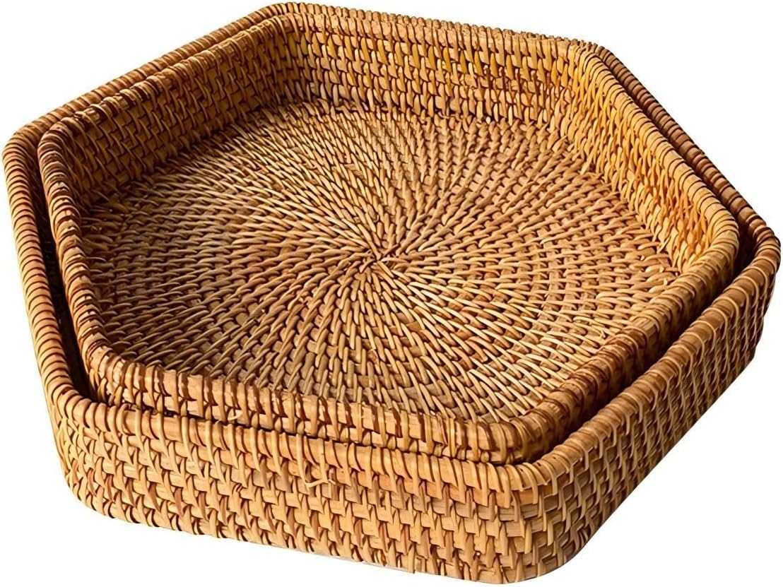 - Versatile Use Cases: This hexagonal rattan two-piece set can be used as a fruit bowl, nuts gift basket, or bread box, suitable for various occasions. Whether as a coffee table tray or decorative tray, the hexagonal tray design adds natural beauty to your home