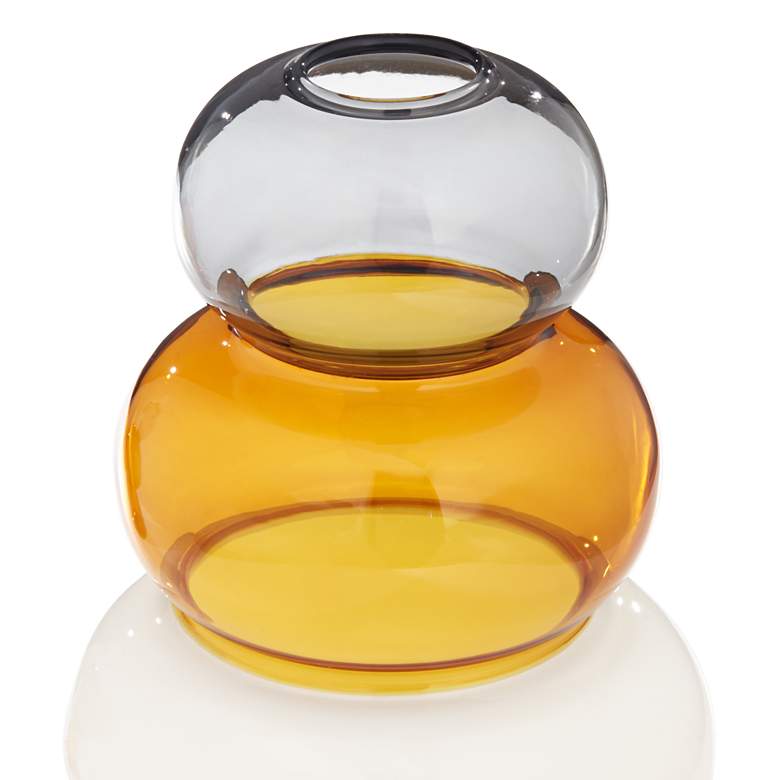 Amber glass adds warmth and texture to this mid-century inspired set of two vases. Each vase is comprised of three glass sections fused together to create shape and interest. The vases would look lovely together on a table or used separately in different parts of the home.