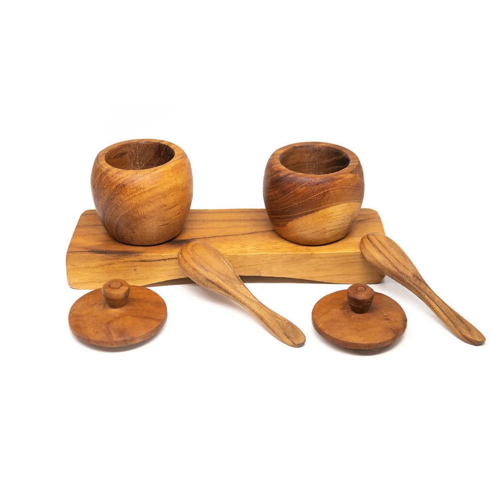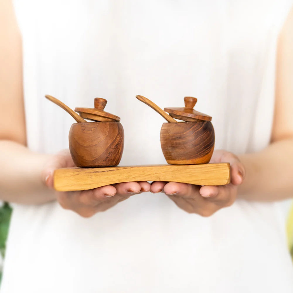 UNIQUE STYLE, CARVED BY CRAFTSMEN: Our Set of 2 Teak Wood Spice Jars w/ Tray, Lid & Spoons is a Rainforest Bowls in-house design painstakingly hand carved out of prized Javanese teak wood by our team of Indonesian master wood artisans.