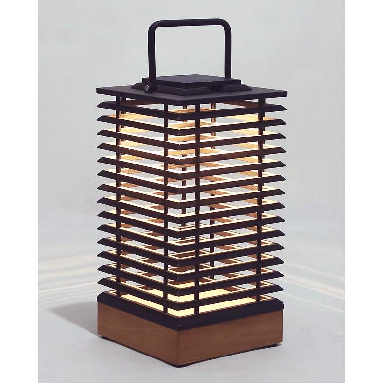 Architectural flair rules the day in this contemporary, energy-efficient LED outdoor solar lantern. Beautiful in the garden or on the patio, the 23 1/2-inch high lantern is portable and features an oiled teak base paired with a slate finish for a sleek, modern look. The lantern features spaced, stacked open frames that provide both structure and a compelling profile. Solar and USB rechargeable, the lantern includes a motion sensor and two batteries.