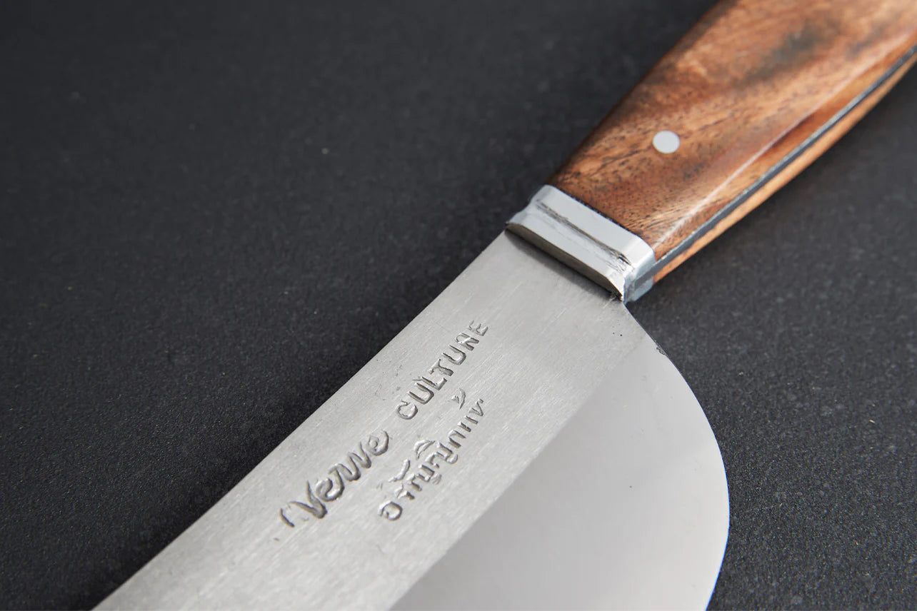 From beautiful swords to chef’s knives, our Thai blacksmiths have adapted their skills since the days of the Thai-Burma war. Today, they make Thai knives from stainless steel, cut and sharpened to traditional standards. This chef's knife has a full tang blade set in a smooth, native Thai Pradu wood handle. It’s a medium-weight cleaver with rounded corners, making it a hard-working jack-of-all-trades that feels just right in your hand. Great for all-around cooking.