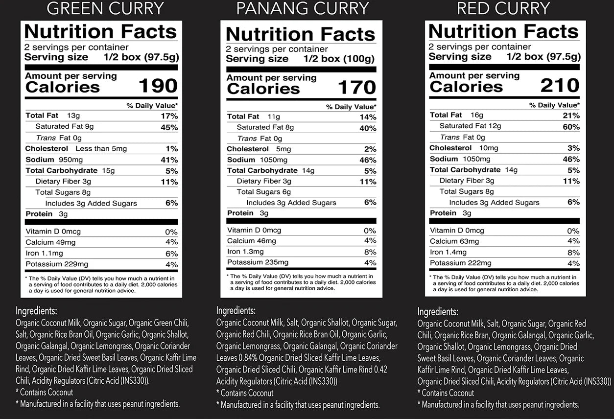 Our Thai curry sampler set includes: green curry, red curry, and panang curry. No matter what your taste, you’ll find your favorite.