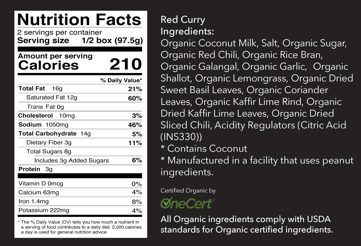 Organic Coconut Milk, Salt, Organic Sugar, Organic Red Chili, Organic Rice Bran, Organic Galangal, Organic Garlic, Organic Shallot, Organic Lemongrass, Organic Dried Sweet Basil Leaves, Organic Coriander Leaves, Organic Kaffir Lime Rind, Organic Dried Kaffir Lime Leaves, Organic Dried Sliced Chili, Acidity Regulators (Citric Acid (INS330))