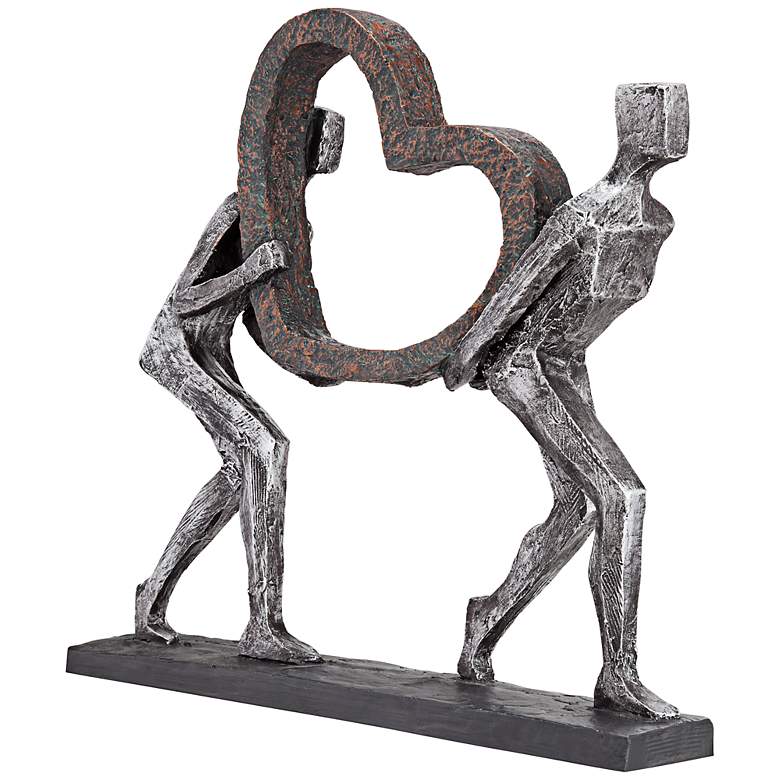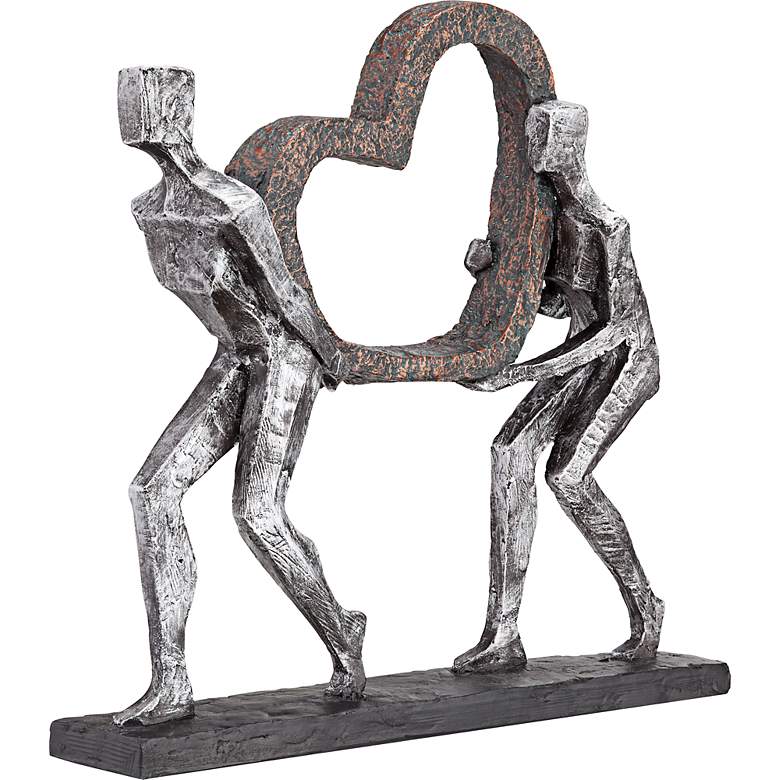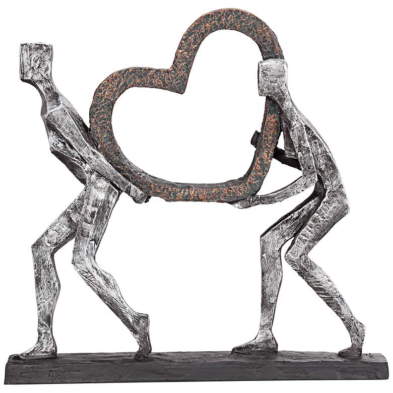 Perfect for accenting a contemporary space, this artistic resin figurine depicts two abstract human shapes carrying a heart, The heart comes in a bronze finish, while the human figures are in a two-tone silver finish. Rectangular base is in a dark bronze finish.