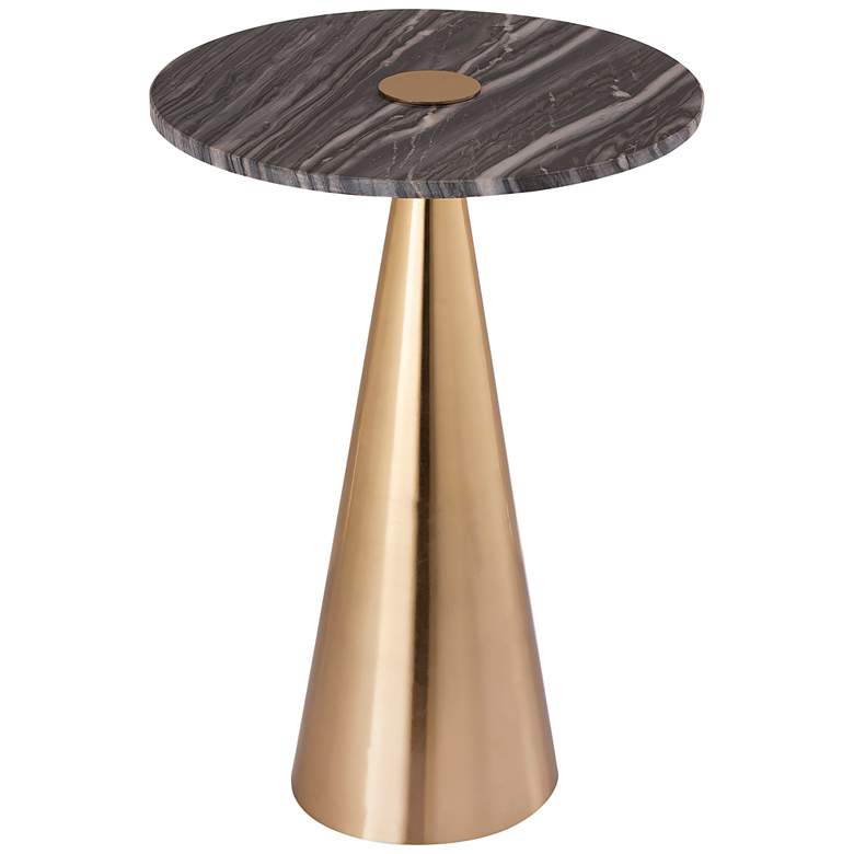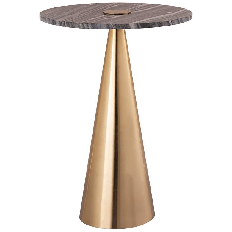 - Gray natural finish marble top. Brushed gold finish over iron construction. Conical pedestal base.