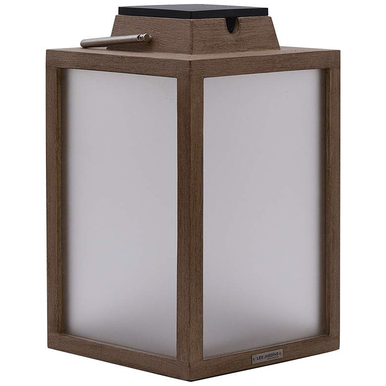 From Les Jardins and the Tradition collection, this rustic LED outdoor solar lantern is a charming finishing touch on the patio or in your landscaping. Its weathered teak finish, classic rectangular profile glows with illumination comparable to a 40 watt incandescent, all powered by the sun so no additional wiring is needed. A stylish handle completes the look and makes this lantern a perfect choice to hang from a tree in the front yard, with the versatility to place it on the patio, flanking an armchair, or as a centerpiece on your outdoor dining table.