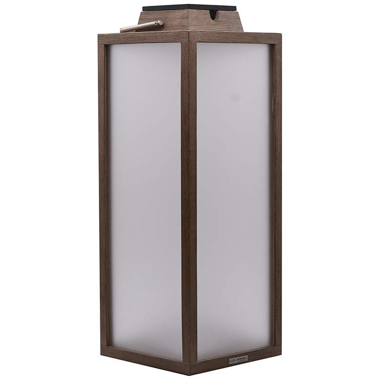 From Les Jardins and the Tradition collection, this rustic LED outdoor solar lantern is a charming finishing touch on the patio or in your landscaping. Its weathered teak finish, classic rectangular profile glows with illumination comparable to a 40 watt incandescent, all powered by the sun so no additional wiring is needed. A stylish handle completes the look and makes this lantern a perfect choice to hang from a tree in the front yard, with the versatility to place it on the patio, flanking an armchair, or in the garden.
