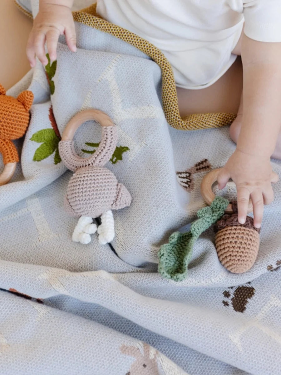 Crafted for tiny hands, this tree teether doubles as a playful rattle, creating a delightful sensory experience. Made from soft cotton and beech wood for safe chewing, it's the perfect blend of fun and functionality. Pair with a blanket or hat for a complete gift set.