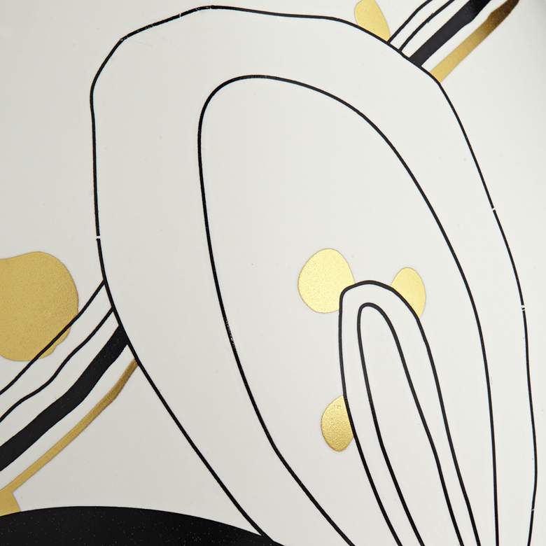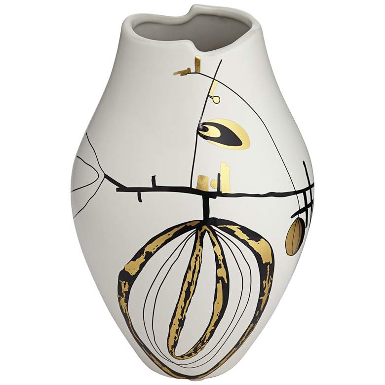 Gentle curves and an asymmetric neck create movement and dimension for this modern stoneware graphic vase. Hand-made, it's a distinctive decorative addition in a living or dining room, offering a matte white finish and abstract graphic art designs in hues of gleaming gold, gray, and black. Add flowers or display alone to equally stunning effect.