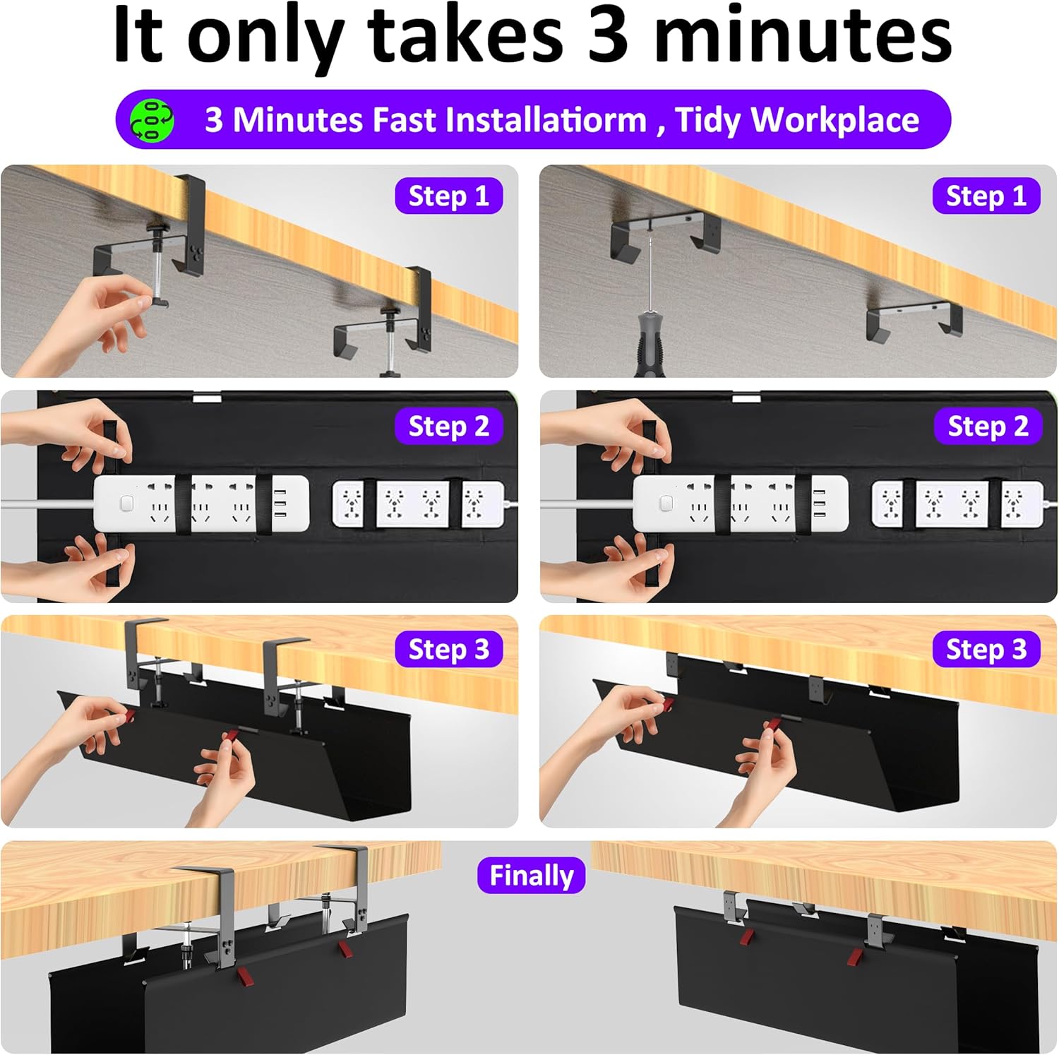 - 【Easy Installation】: Our under-desk cable tray features two installation methods, with optional clip-on or screw-mounted brackets. The process is effortless and convenient, requiring no drilling. Simply clamp or tighten easily to quickly complete the installation of the computer cable organizer.