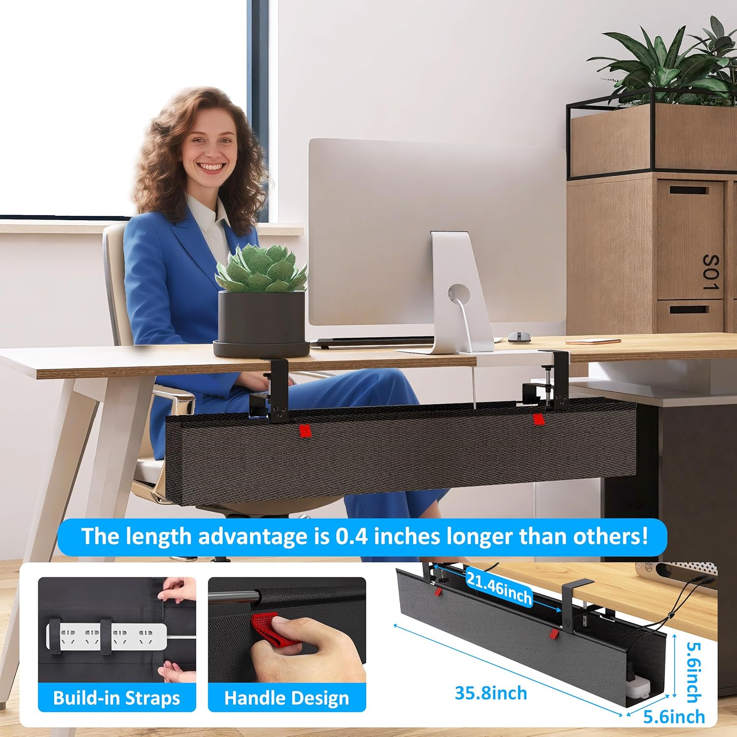 - 【Premium Quality】: A high-quality under-desk premium fabric cable organizer made of thickened flame-retardant Oxford cloth, which effectively enhances safety. It can hide wires and power strips, offering flame resistance and dust protection, thus creating a safe, neat and orderly cable management tray for standing desks.