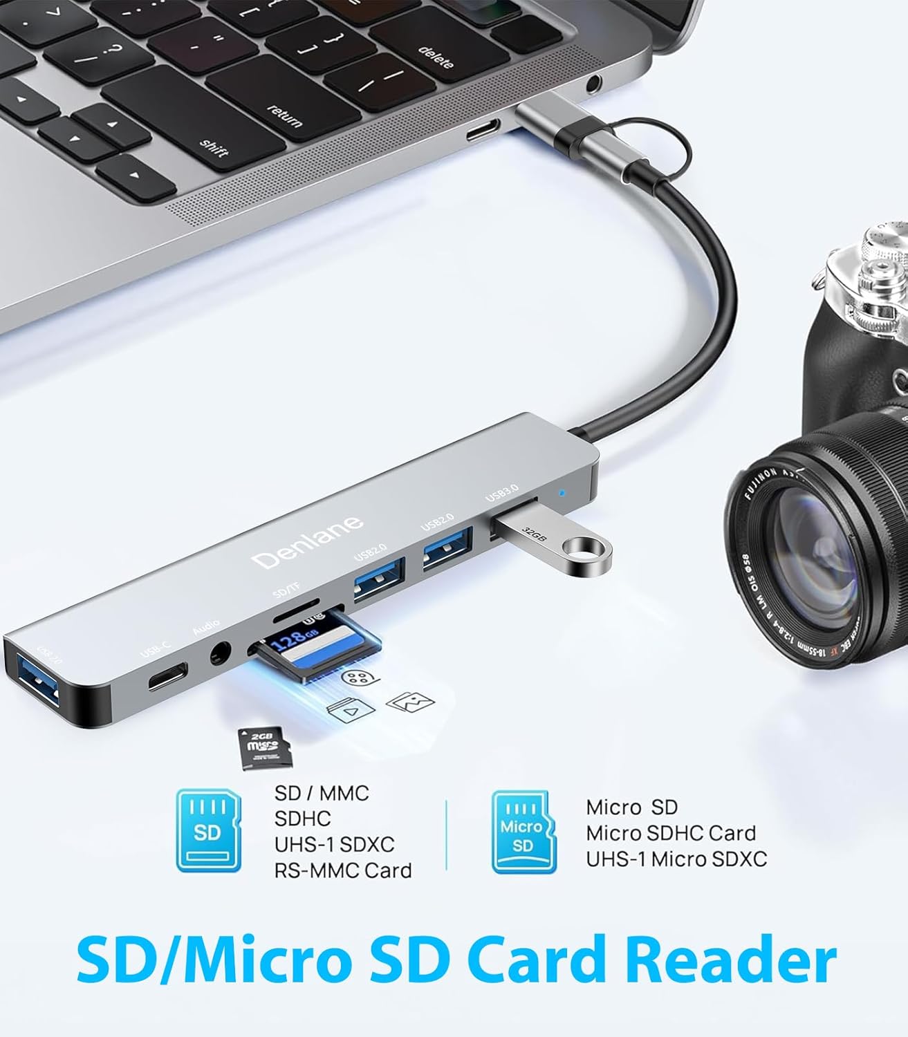 - 2025 Upgrade USB Hub, Expand Multiple Ports: Denlane 8-in-2 usb hub/usb c hub perfectly solves the problem of insufficient computer ports and effectively organizes messy cables. Includes interfaces: usb 3.0*1(5Gbps), usb 2.0*4(480Mbps), usb-c date trasfer*1, tf&sd card reader*1, 3.5mm audio adapter*1