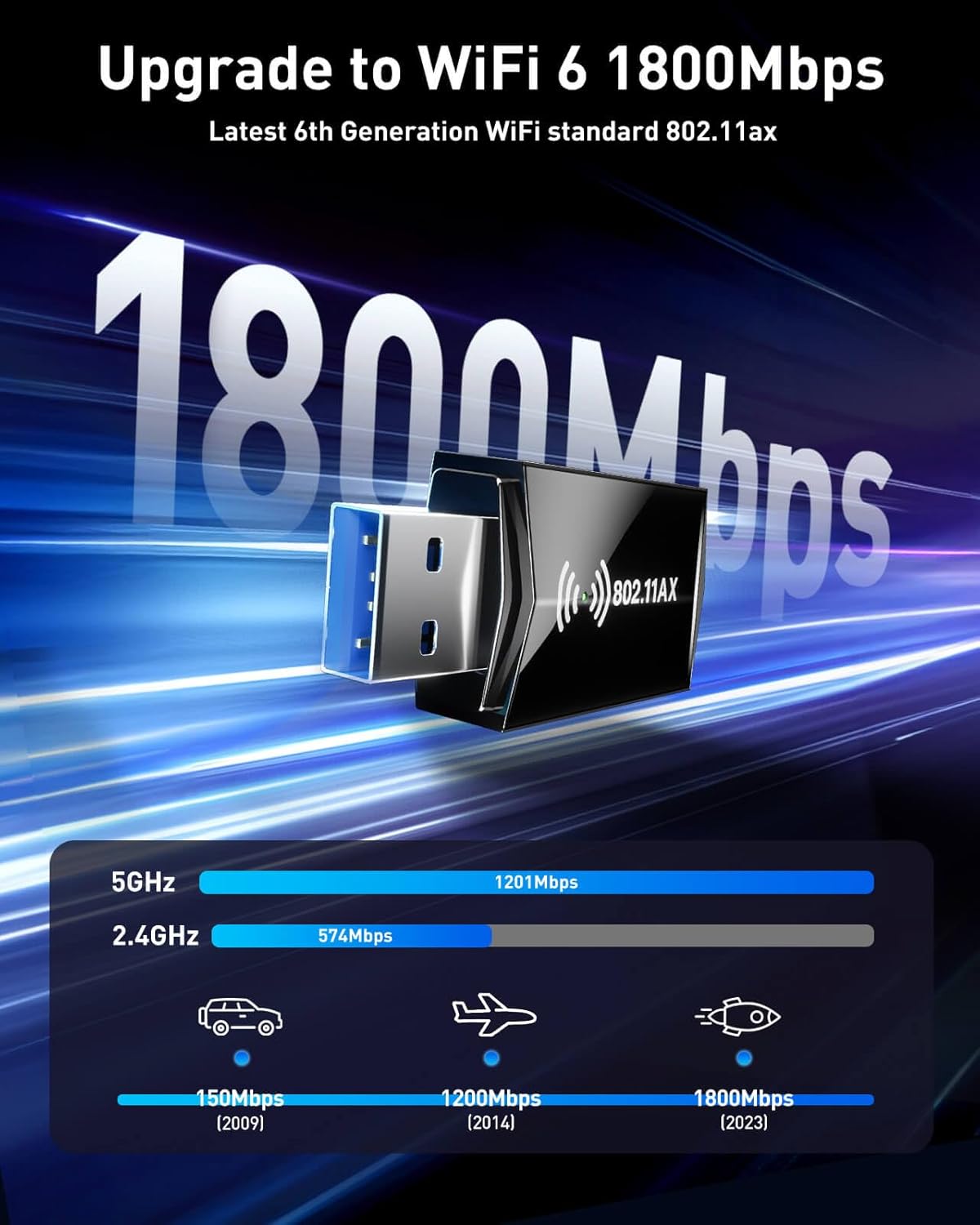 - 1800Mbps High WiFI SPEED 5G/2.4G - Upgrade to latest Wi-Fi 6th Standard on your Laptop or computer for a jump in performance,USB Wifi Adapter for PC, 802.11AX Wifi USB, Dual Band WiFi Dongle, up to 1201Mbps on 5GHz band or 574Mbps on 2.4GHz band.
