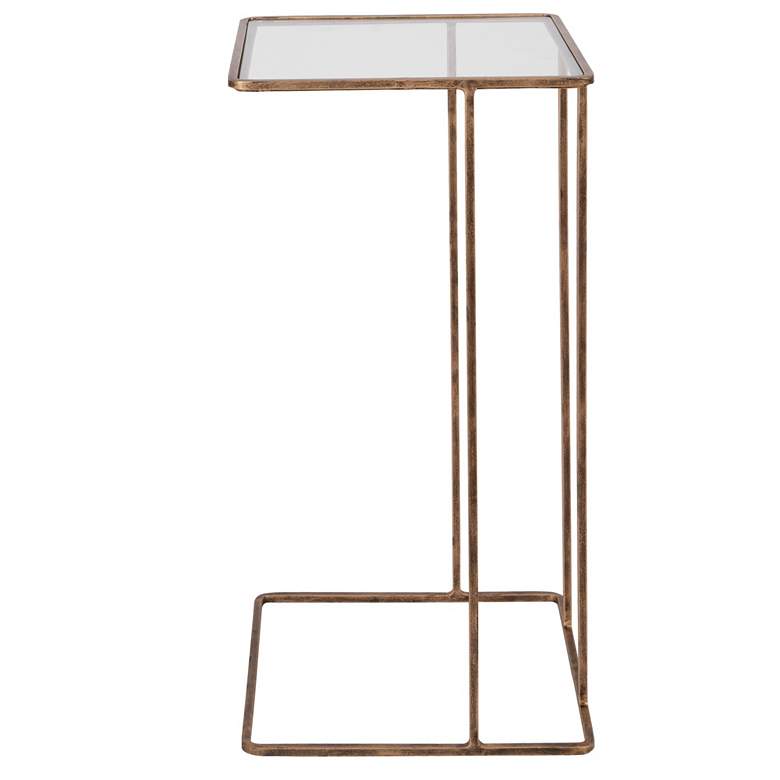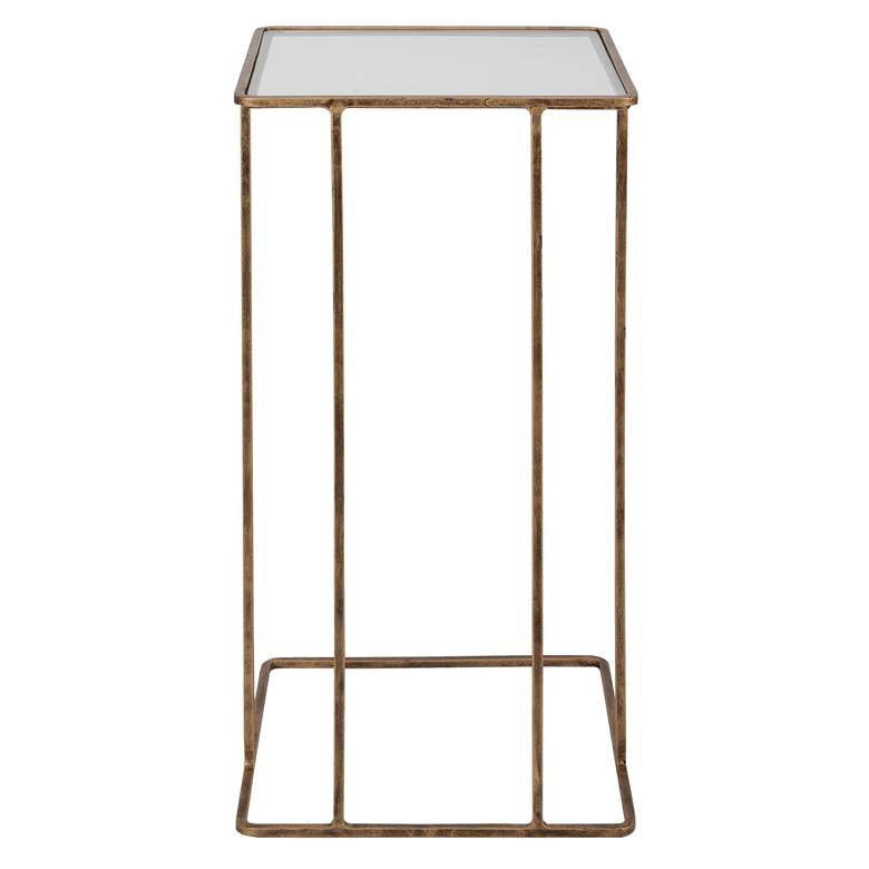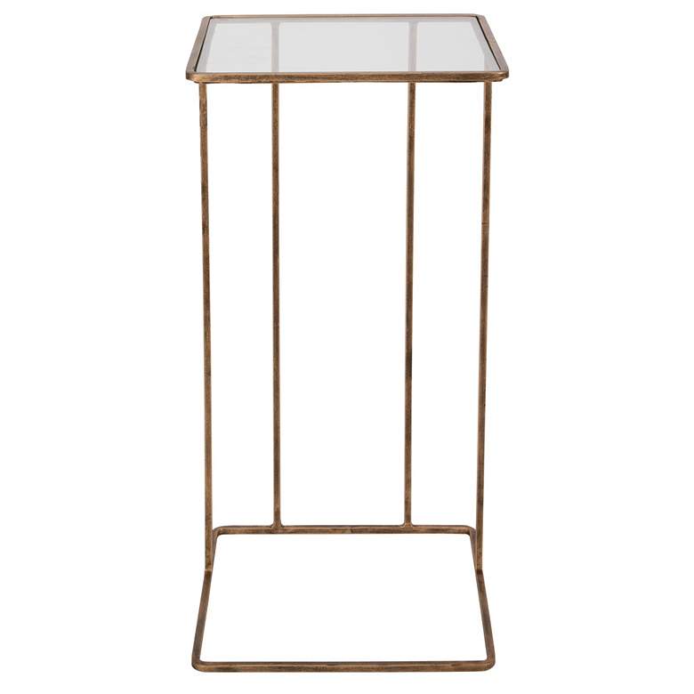 Clean, straight lines form in a simple silhouette, offering a stylized modern look perfect for serving spaces. The Cadmus contemporary side table by Uttermost fits in with transitional and updated modern furnishings, offering a warm antiqued gold finish over hand-forced iron frame construction. Topped with a clear tempered glass surface, its elegance is pristine.