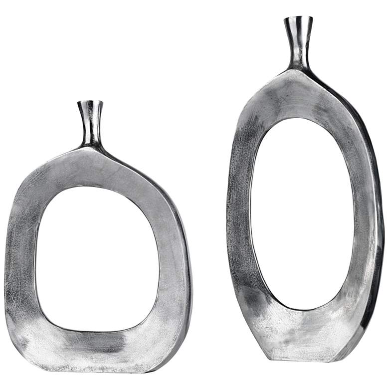 Made from aluminum with a sleek nickel finish, it offers an artistic and attention-commanding appeal. Crafters from Uttermost present a set of generously sized vases with an intriguing abstract profile. This contemporary 2-piece oversized vase set offers generous display space for treasured greenery