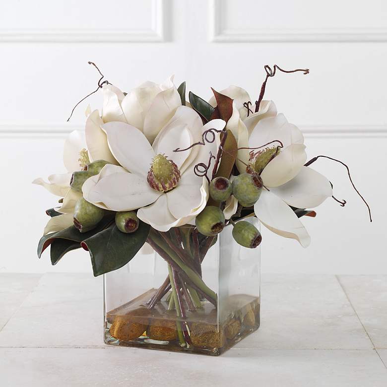 The addition of natural river stone enhances the realism of this modern faux flower arrangement. From Uttermost, it features a square clear glass vase complete with faux water. The white magnolia blooms and green leaves and seed pods add character and organic color, perfect for a coffee table or console.