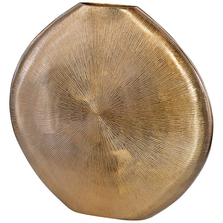 Decadence and rich color blend to present a compelling piece of decor that sets the pace for exotic beauty. With a ribbed gold finish, this luscious vase is fashioned from aluminum for a lightweight yet solid feel. Radiating subtle ribs offer texturizing effects to this vase with a dynamic abstract silhouette. From the Gretchen collection by Uttermost.