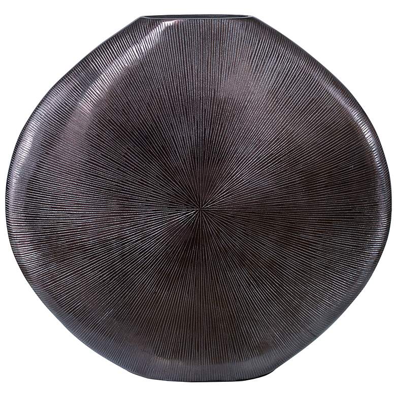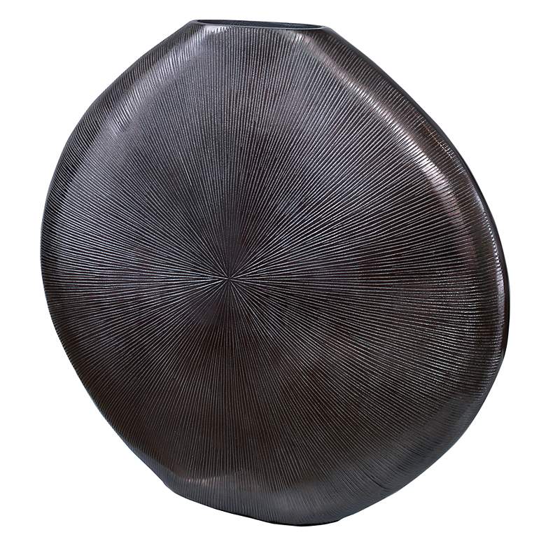 Blending elements of sculpture, this modern contemporary metal vase is a true statement piece on a console or buffet. Designed by Uttermost, it features a radiant pattern over a flat, abstract round shape, perfect for depth and dimension. A black finish highlights its texture, while adding a bold look and feel perfect for refined decor.