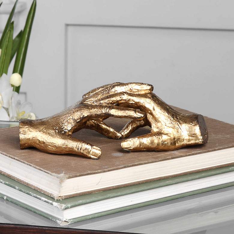 Create a sense of intimacy perfect for a den or bedroom with this modern metal figurine. From Uttermost, it features two human hands with fingers intertwined, all in a textured antique gold finish over cast iron construction. One hand appears masculine, one feminine, with a charming aura of eternity to enhance your space.