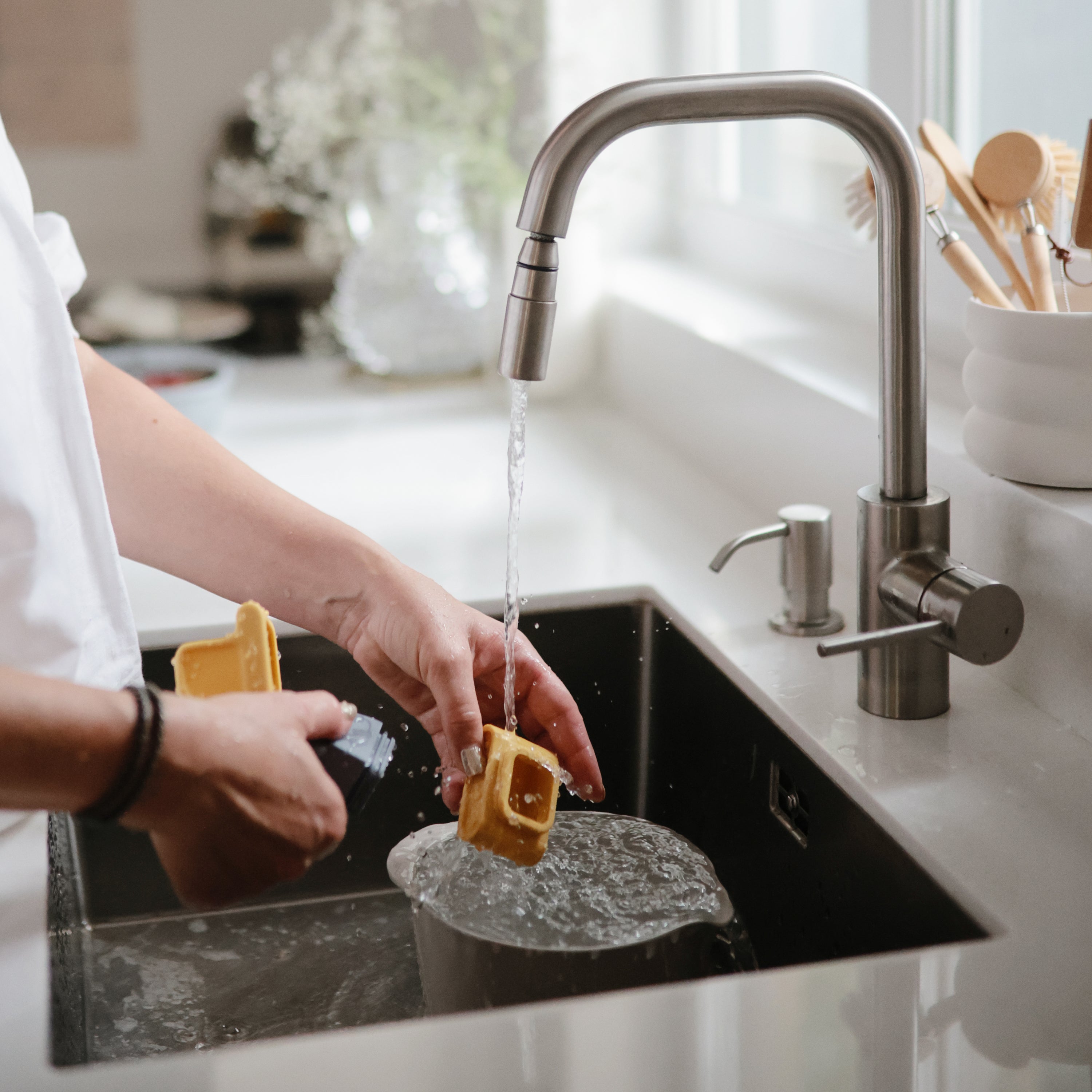 Wash with warm water and mild soap or place on top rack of dishwasher. Avoid harsh or scented cleaners.