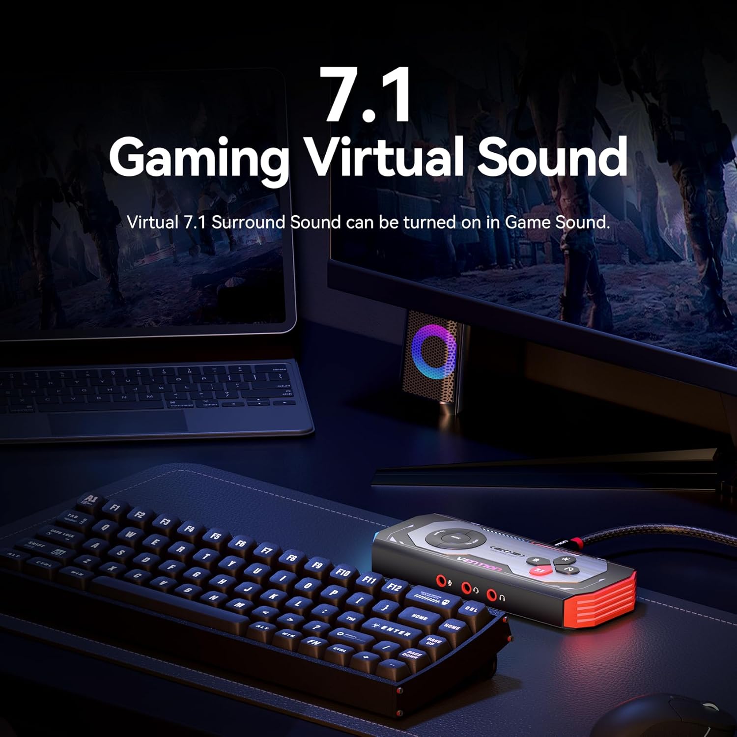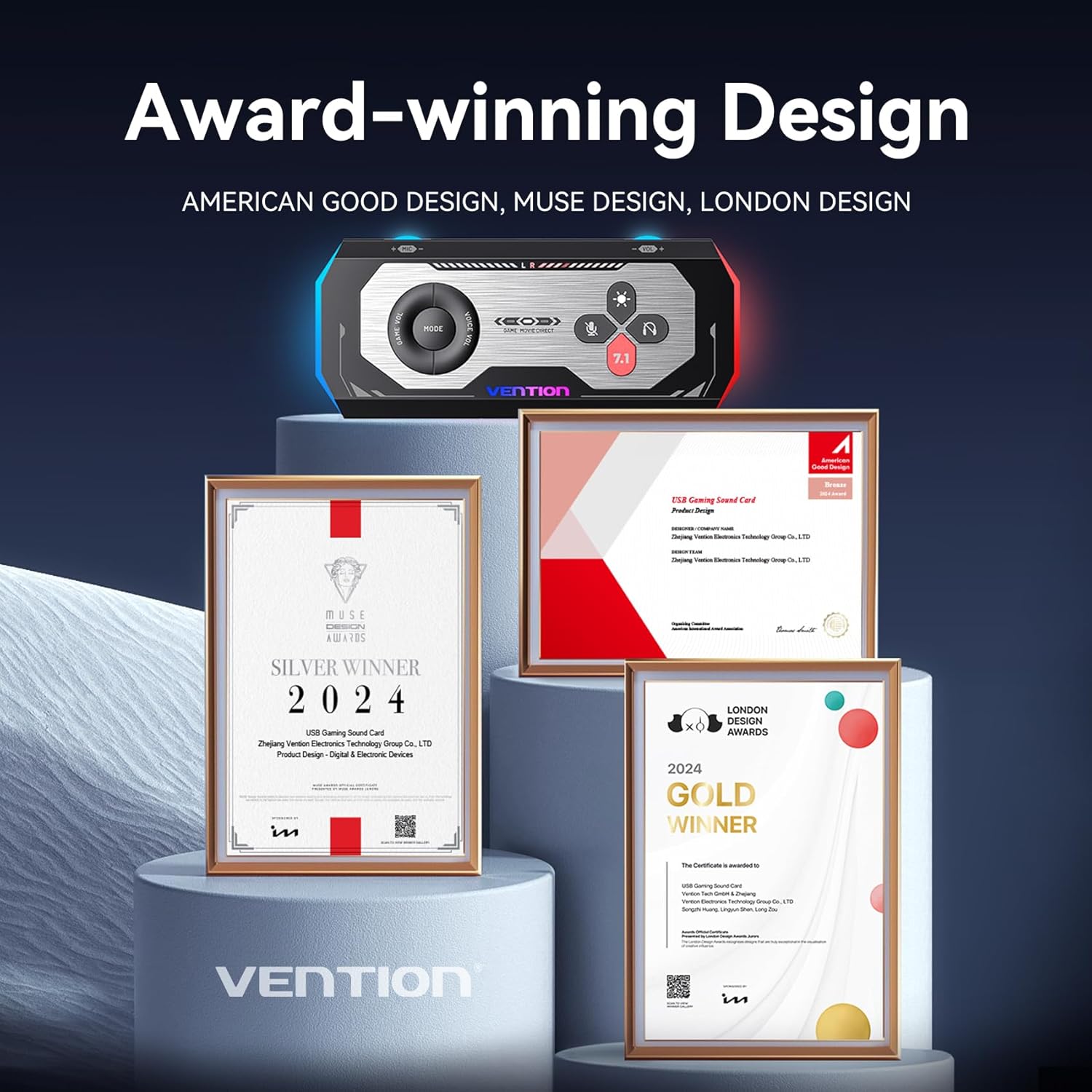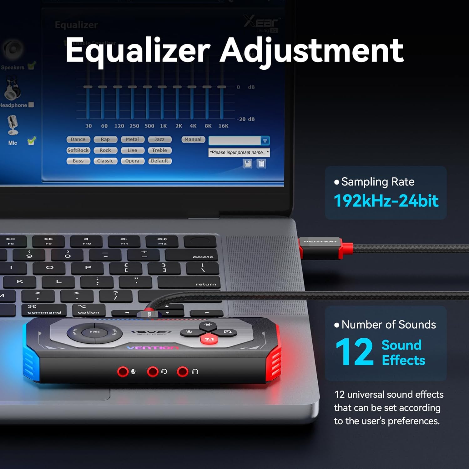 - 7.1 Surround Sound Experience: The VENTION External USB Sound Card Gaming Dac for Laptop PC uses advanced audio processing technology to enable your device to support virtual 7.1 surround sound; Whether you are gaming or watching movies, it creates an immersive auditory experience, allowing you to perceive sound from various directions clearly, enhancing your overall immersion