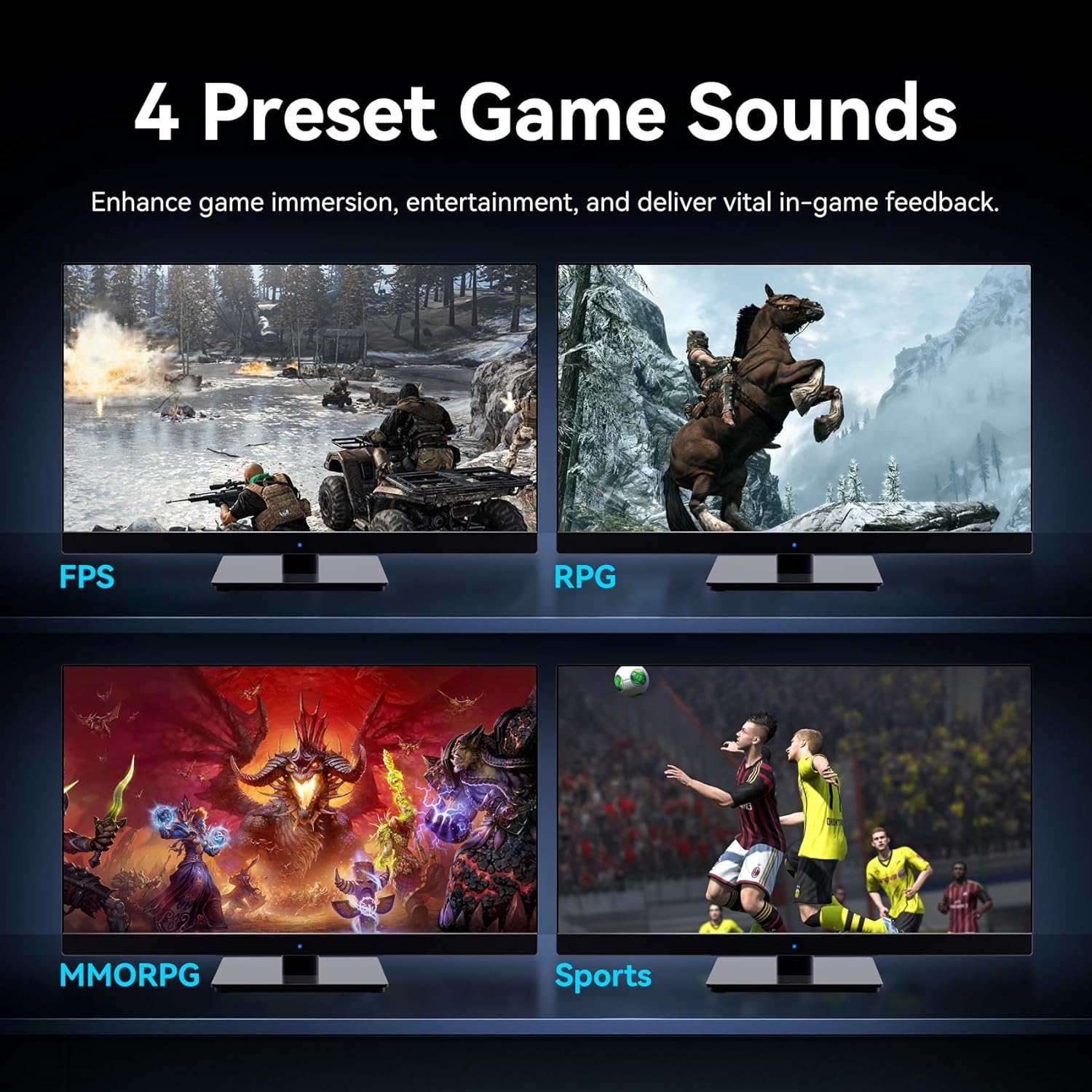 - Independent Equalizer: The independent equalizer comes with 16 preset sound effects, allowing you to finely adjust audio frequencies to meet your personalized needs; Volume control and one-click mute ensure you can conveniently adjust sound levels for the best audio experience; Additionally, you can switch between gaming mode, cinema mode, and standard sound mode with one click, catering to different occasions