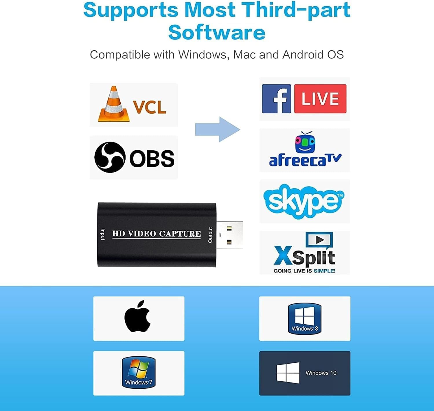 - 【Wide Compatibility】The video capture card adopts advanced chips, intelligent identification equipment, and is widely compatible with electronic equipment, which can easily capture wonderful moments and comes with a USB cable. It supports third-party video capture software such as OBS, Win, MacOs, Android, etc. It can also perform video capture and online live broadcast at the same time, store and share videos at the same time, and easily realize video splicing, which is very convenient.