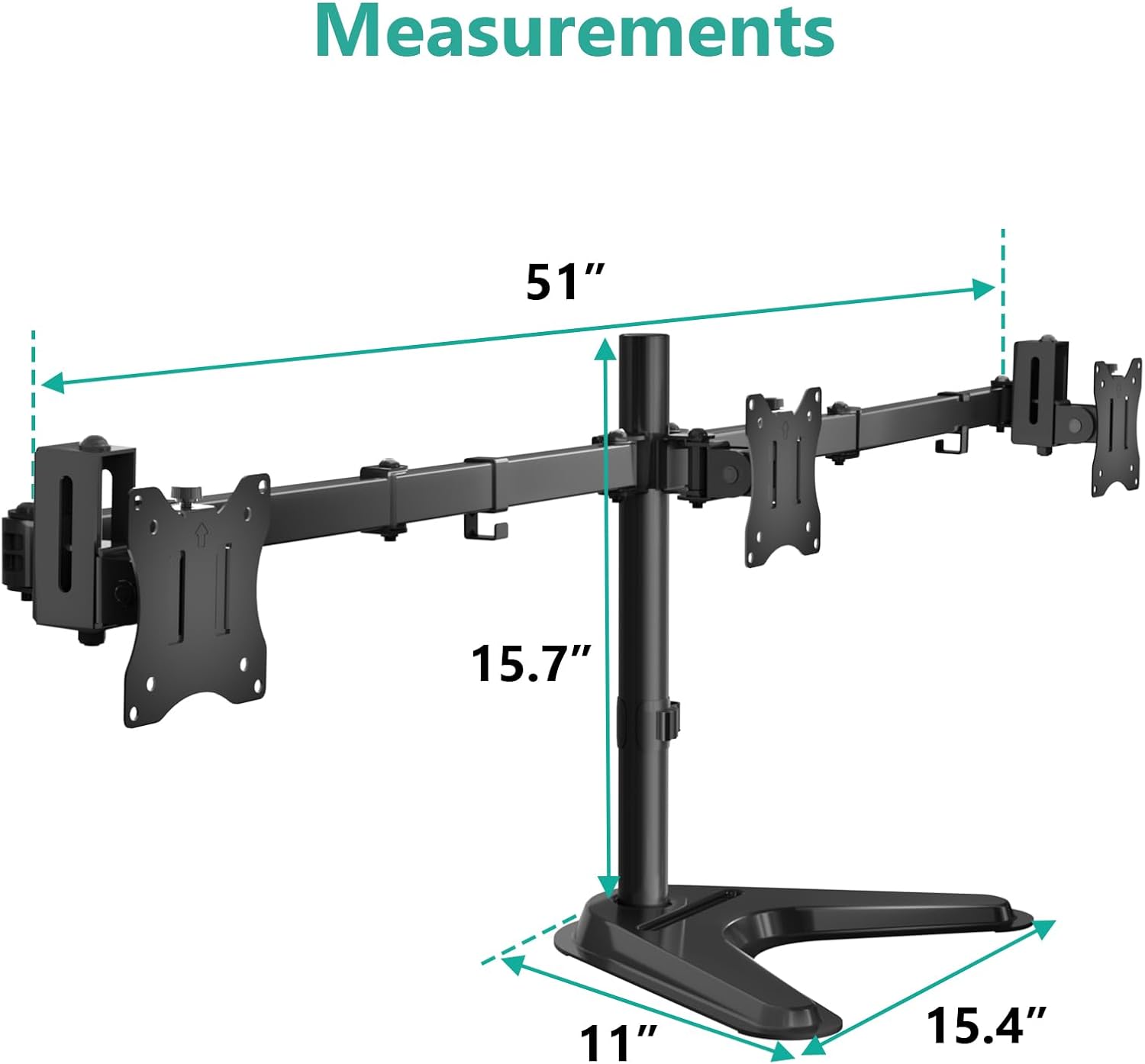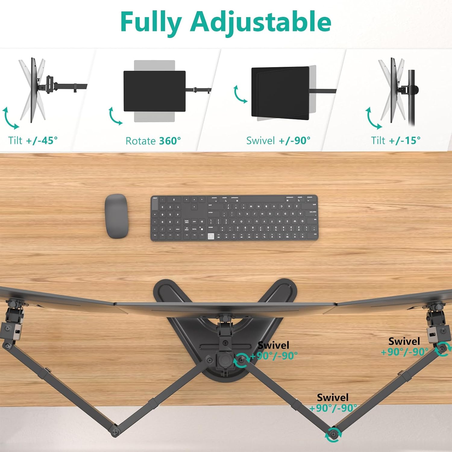 - Fully Adjustable Mount Arms: The monitor arm can tilt +45°/-45°, swivel +90°/-90°, and rotate 360°, Max height is up to 15.7", and max extension is up to 25.5". The triple monitor stand allow easy to adjust monitors swivel, tilt and rotate to find an optimal view angle and position for comfortable work.