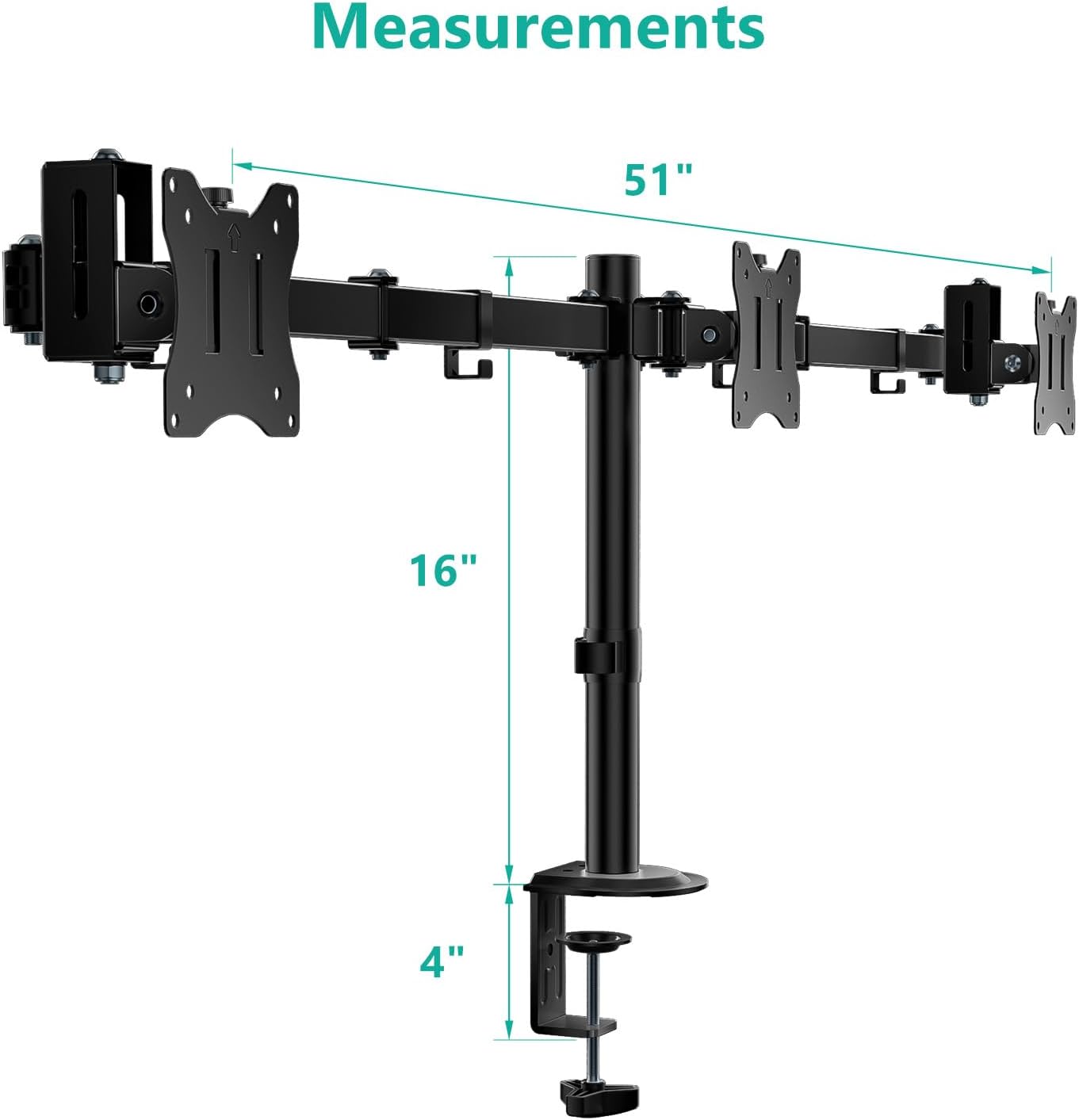 - Desk Space Saver: Conveniently frees up more valuable work space by elevating 3 monitors off of your desk, making your workstation spacious and clutter-free. Integrated cable management to keep cables tucked in arm neatly, hide the sore eyes wire clutter.