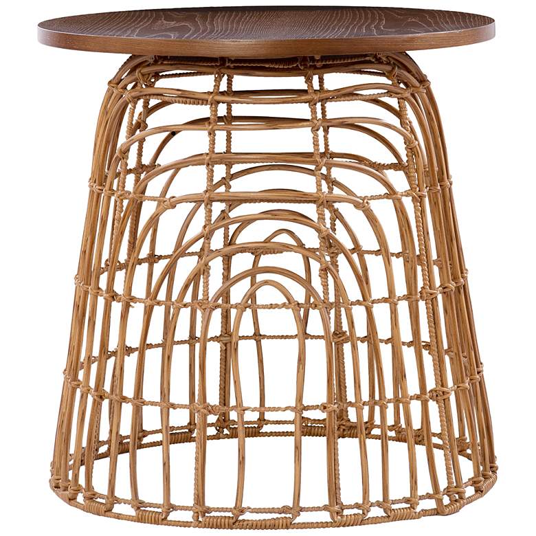 Embrace an island natural ambiance with this farmhouse rustic round accent table, a splendid selection for a casual space. Adding a hint of coastal charm, this table from the Weaverdon collection is made of natural finish engineered wood and oak veneer with a powder coated iron base. Busy weaving in an openwork base offers a freshly inspired approach to furnishings.