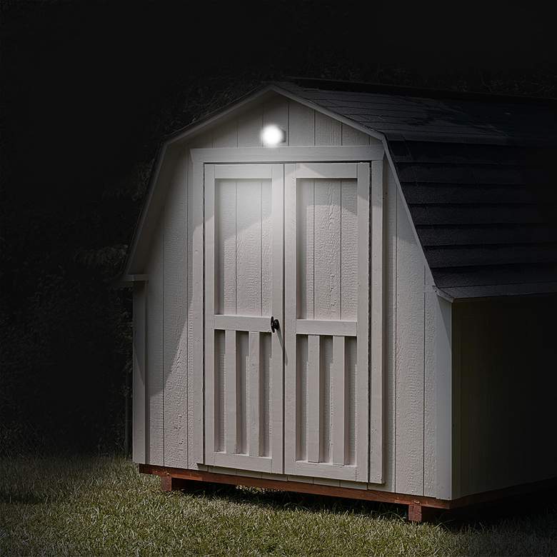 Sleek modern style updates the look of this compact five-inch-wide black LED compact motion security light. Wireless operation offers freedom from direct wiring, bringing lighting virtually anywhere, including dark corners, doorways, and outbuildings. This energy-efficient light detects motion at an angle of 120 degrees from up to 30 feet away, with a 270-degree rotating head. Produces 120 lumens of 6000K white light.