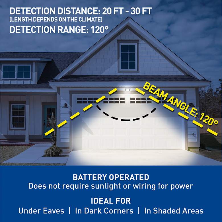 Take a new approach to exterior security measures with this black finish standard wireless LED motion-activated security light. Avoid direct wiring while bringing illumination virtually anywhere, including dark corners, doorways, and outbuildings. This energy-efficient light detects motion at an angle of 120 degrees from up to 30 feet away, with a 270-degree rotating head. Produces bright 6000K white light.