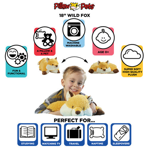 - SPECIFICS: Official Pillow Pets product. Fox stuffed animal and pillow made of high-quality washable plush fabrics, BPA-free and Phthalates-free materials. Opens to an 18-inch flat stuffed toy. All sizes are approximate. Ages 0+.