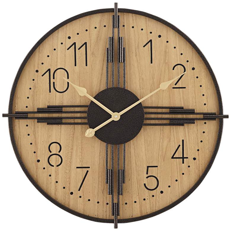 Put a vintage spin on any wall space with a charming wall clock from the Dahlia Studios brand. The York wall clock has a matte wood grain clock face that adds a natural touch to your decor. Stylized numerals and minute markers add readability, while an architectural iron overlay in an antique bronze finish adds dimension and detail. A matching frame adds a perfect final touch to this engaging wall clock design.